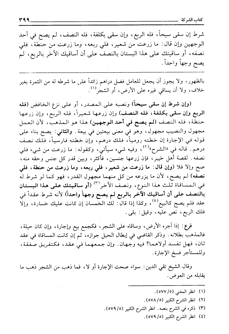 شَرَطَ إِنْ سَقَى سَيْحًا فَلَهُ الرُّبُعُ، وَإِنْ سَقَى بِكُلْفَةٍ فَلَهُ النِّصْفُ لَمْ يَصِحَّ فِي أَحَدِ الْوَجْهَيْنِ، وَإِنْ قَالَ: مَا زَرَعْتَ مِنْ شَعِيرٍ فَلِيَ رُبُعُهُ، وَمَا زَرَعْتَ مِنْ حِنْطَةٍ فَلِيَ نِصْفُهُ، أَوْ سَاقَيْتُكَ عَلَى هَذَا الْبُسْتَانِ بِالنِّصْفِ عَلَى أَنْ أُسَاقِيَكَ الْآخَرَ بِالرُّبُعِ لَمْ يَصِحَّ وَجْهًا وَاحِدًا.