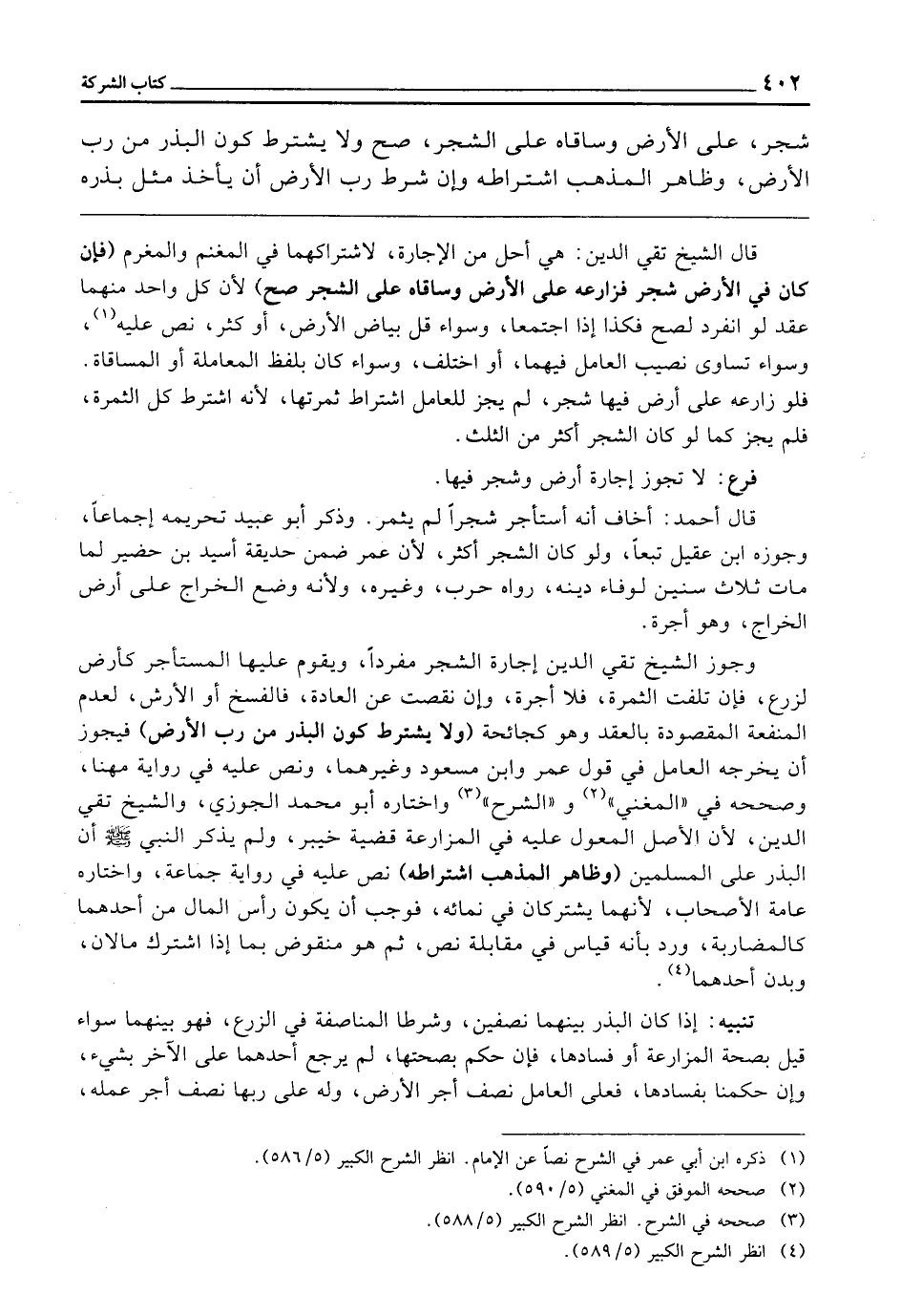 ـــــــــــــــــــــــــــــQقَالَ الشَّيْخُ تَقِيُّ الدِّينِ: هِيَ أَحَلُّ مِنَ الْإِجَارَةِ لِاشْتِرَاكِهِمَا فِي الْمَغْنَمِ وَالْمَغْرَمِ (فَإِنْ كَانَ فِي الْأَرْضِ شَجَرٌ فَزَارَعَهُ عَلَى الْأَرْضِ وَسَاقَاهُ عَلَى الشَّجَرِ صَحَّ) لِأَنَّ كُلَّ وَاحِدٍ مِنْهُمَا عَقْدٌ لَوِ انْفَرَدَ لَصَحَّ، فَكَذَا إِذَا اجْتَمَعَا، وَسَوَاءٌ قُلَّ بَيَاضُ الْأَرْضِ أَوْ كَثُرَ، نَصَّ عَلَيْهِ، وَسَوَاءٌ تَسَاوَى نَصِيبُ الْعَامِلِ فِيهِمَا أَوِ اخْتَلَفَ، وَسَوَاءٌ كَانَ بِلَفْظِ الْمُعَامَلَةِ أَوِ الْمُسَاقَاةَ فَلَوْ زَارَعَهُ عَلَى أَرْضٍ فِيهَا شَجَرٌ لَمْ يَجُزْ لِلْعَامِلِ اشْتِرَاطُ ثَمَرَتِهَا ; لِأَنَّهُ اشْتَرَطَ كُلَّ الثَّمَرَةِ، فَلَمْ يَجُزْ كَمَا لَوْ كَانَ الشَّجَرُ أَكْثَرَ مِنَ الثُّلُثِ.