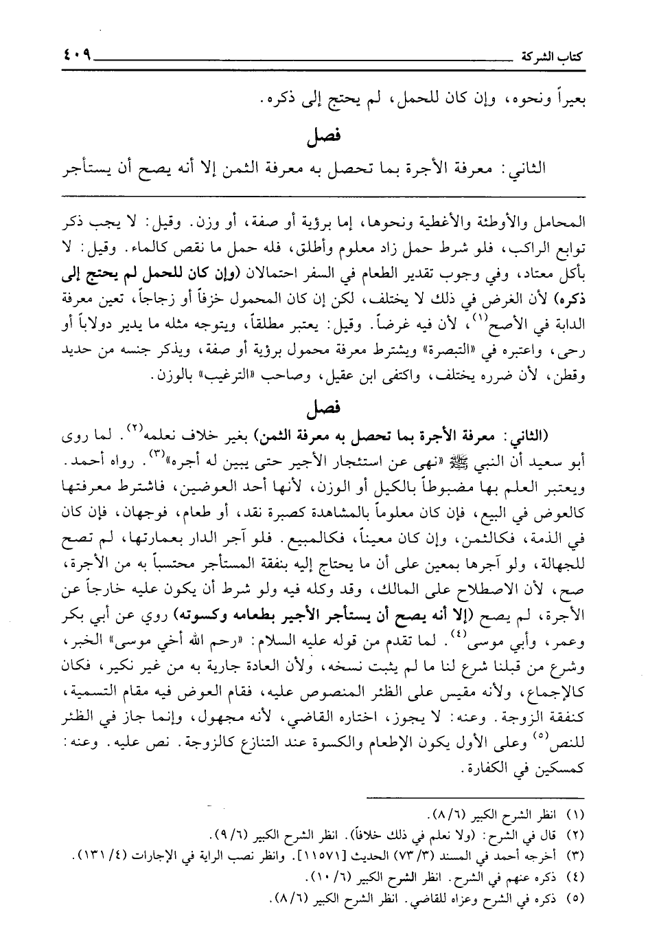 (الثَّانِي مَعْرِفَةُ الْأُجْرَةِ بِمَا تَحْصُلُ بِهِ مَعْرِفَةُ الثَّمَنِ) بِغَيْرِ خِلَافٍ نَعْلَمُهُ لِمَا رَوَى أَبُو سَعِيدٍ أَنَّ النَّبِيَّ - صَلَّى اللَّهُ عَلَيْهِ وَسَلَّمَ - «نَهَى عَنِ اسْتِئْجَارِ الْأَجِيرِ حَتَّى يُبَيَّنَ لَهُ أَجْرُهُ» ، رَوَاهُ أَحْمَدُ، وَيُعْتَبَرُ الْعِلْمُ بِهَا مَضْبُوطًا بِالْكَيْلِ، أَوِ الْوَزْنِ ; لِأَنَّهَا أَحَدُ الْعِوَضَيْنِ فَاشْتُرِطَ مَعْرِفَتُهَا كَالْعِوَضِ فِي الْبَيْعِ، فَإِنْ كَانَ مَعْلُومًا بِالْمُشَاهَدَةِ كَصَبْرَةِ نَقْدٍ، أَوْ طَعَامٍ، فَوَجْهَانِ، فَإِنْ كَانَ فِي الذِّمَّةِ، فَكَالثَّمَنِ، وَإِنْ كَانَ مُعَيَّنًا، فَكَالْمَبِيعِ، فَلَوْ آجَرَ الدَّارَ بِعِمَارَتِهَا لَمْ تَصِحَّ لِلْجَهَالَةِ، وَلَوْ آجَرَهَا بِمُعَيَّنٍ عَلَى أَنَّ مَا يُحْتَاجُ إِلَيْهِ بِنَفَقَةِ الْمُسْتَأْجِرِ مُحْتَسَبًا بِهِ مِنَ الْأُجْرَةِ صَحَّ ; لِأَنَّ الِاصْطِلَاحَ عَلَى الْمَالِكِ، وَقَدْ وَكَّلَهُ فِيهِ، وَلَوْ شَرَطَ أَنْ يَكُونَ عَلَيْهِ خَارِجًا عَنِ الْأُجْرَةِ لَمْ يَصِحَّ (إِلَّا أَنَّهُ يَصِحُّ أَنْ يَسْتَأْجِرَ الْأَجِيرَ بِطَعَامِهِ وَكُسْوَتِهِ) رُوِيَ عَنْ أَبِي بَكْرٍ، وَعُمَرَ، وَأَبِي مُوسَى لِمَا تَقَدَّمَ مِنْ قَوْلِهِ - عَلَيْهِ السَّلَامُ - «رَحِمَ اللَّهُ أَخِي مُوسَى» الْخَبَرَ، وَشَرْعُ مَنْ قَبْلَنَا شَرْعٌ لَنَا مَا لَمْ يَثْبُتْ نَسْخُهُ، وَلِأَنَّ الْعَادَةَ جَارِيَةٌ بِهِ مِنْ غَيْرِ نَكِيرٍ، فَكَانَ كَالْإِجْمَاعِ، وَلِأَنَّهُ مَقِيسٌ عَلَى الظِّئْرِ الْمَنْصُوصِ عَلَيْهِ فَقَامَ الْعِوَضُ فِيهِ مَقام التَّسْمِيَةِ كَنَفَقَةِ الزَّوْجةِ، وَعَنْهُ: لَا يَجُوزُ، اخْتَارَهُ الْقَاضِي ; لِأَنَّهُ مَجْهُولٌ، وَإِنَّمَا جَازَ فِي الظِّئْرِ لِلنَّصِّ، وَعَلَى الْأَوَّلِ يَكُونُ الْإِطْعَامُ وَالْكُسْوَةُ عِنْدَ التَّنَازُعِ كَالزَّوْجَةِ، نَصَّ عَلَيْهِ، وَعَنْهُ: كَمِسْكِينٍ فِي الْكَفَّارَةِ.