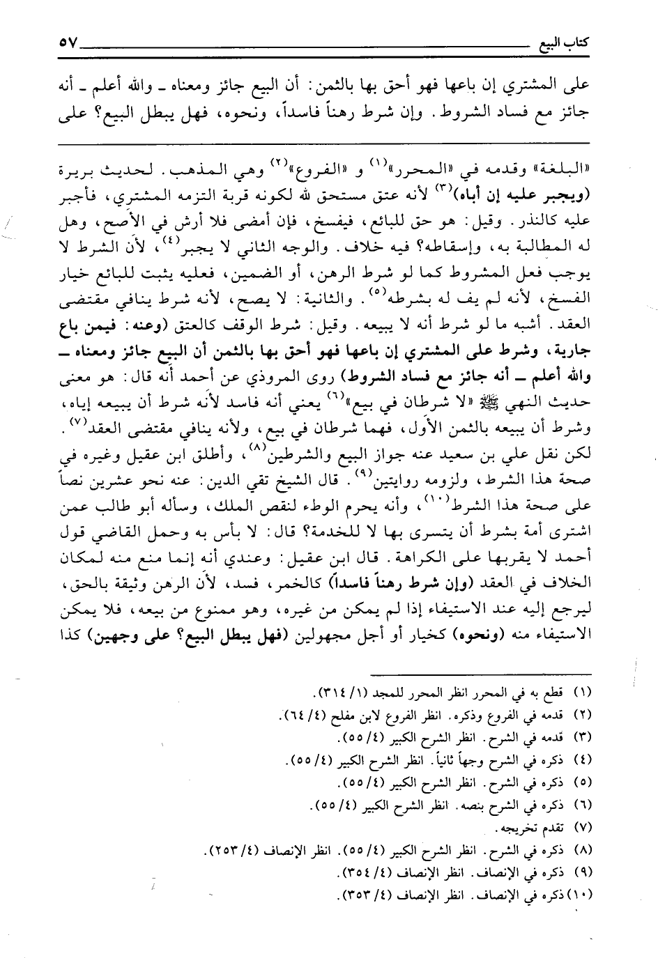 ـــــــــــــــــــــــــــــQ" الْبُلْغَةِ " وَقَدَّمَهُ فِي " الْمُحَرَّرِ "، وَ " الْفُرُوعِ " وَهِيَ الْمَذْهَبُ لِحَدِيثِ بَرِيرَةَ (وَيُجْبَرُ عَلَيْهِ إِنْ أَبَاهُ) لِأَنَّهُ عِتْقٌ مُسْتَحَقٌّ لِلَّهِ لِكَوْنِهِ قُرْبَةً الْتَزَمَهُ الْمُشْتَرِي فَأُجْبِرَ عَلَيْهِ كَالنَّذْرِ، وَقِيلَ: هُوَ حَقٌّ لِلْبَائِعِ فَيُفْسَخُ، فَإِنْ أَمْضَى، فَلَا أَرْشَ فِي الْأَصَحِّ، وَهَلْ لَهُ الْمُطَالَبَةُ بِهِ وَإِسْقَاطُهُ؟ فِيهِ خِلَافٌ، وَالْوَجْهُ الثَّانِي: لَا يُجْبَرُ؛ لِأَنَّ الشَّرْطَ لَا يُوجِبُ فِعْلَ الْمَشْرُوطِ، كَمَا لَوْ شَرَطَ الرَّهْنَ، أَوِ الضَّمِينَ فَعَلَيْهِ يَثْبُتُ لِلْبَائِعِ خِيَارُ الْفَسْخِ؛ لِأَنَّهُ لَمْ يَفِ لَهُ بِشَرْطِهِ، وَالثَّانِيَةُ: لَا يَصِحُّ؛ لِأَنَّهُ شَرْطٌ يُنَافِي مُقْتَضَى الْعَقْدِ، أَشْبَهَ مَا لَوْ شَرَطَ أَنْ لَا يَبِيعَهُ، وَقِيلَ: شَرْطُ الْوَقْفِ كَالْعِتْقِ (وَعَنْهُ: فِيمَنْ بَاعَ جَارِيَةً، وَشَرَطَ عَلَى الْمُشْتَرِي إِنْ بَاعَهَا فَهُوَ أَحَقُّ بِهَا بِالثَّمَنِ أَنَّ الْبَيْعَ جَائِزٌ وَمَعْنَاهُ. - وَاللَّهُ أَعْلَمُ - أَنَّهُ جَائِزٌ مَعَ فَسَادِ الشُّرُوطِ) . رَوَى الْمَرُّوذِيُّ، عَنْ أَحْمَدَ أَنَّهُ قَالَ: هُوَ مَعْنَى حَدِيثِ النَّهْيِ - صَلَّى اللَّهُ عَلَيْهِ وَسَلَّمَ - لَا شَرْطَانِ فِي بَيْعٍ، يَعْنِي أَنَّهُ فَاسِدٌ؛ لِأَنَّهُ شَرَطَ أَنْ يَبِيعَهُ إِيَّاهُ، وَشَرَطَ أَنْ يَبِيعَهُ بِالثَّمَنِ الْأَوَّلِ، فَهُمَا شَرْطَانِ فِي بَيْعٍ، وَلِأَنَّهُ يُنَافِي مُقْتَضَى الْعَقْدِ، لَكِنْ نَقَلَ عَلِيُّ بْنُ سَعِيدٍ عَنْهُ جَوَازَ الْبَيْعِ وَالشَّرْطَيْنِ، وَأَطْلَقَ ابْنُ عَقِيلٍ وَغَيْرُهُ فِي صِحَّةِ هَذَا الشَّرْطِ وَلُزُومِهِ رِوَايَتَيْنِ، قَالَ الشَّيْخُ تَقِيُّ الدِّينِ: عَنْهُ نَحْوَ عِشْرِينَ نَصًّا عَلَى صِحَّةِ هَذَا الشَّرْطِ، وَأَنَّهُ يَحْرُمُ الْوَطْءُ لِنَقْصِ الْمِلْكِ، وَسَأَلَهُ أَبُو طَالِبٍ عَمَّنِ اشْتَرَى أَمَةً بِشَرْطِ أَنْ يَتَسَرَّى بِهَا لَا لِلْخِدْمَةِ قَالَ: لَا بَأْسَ بِهِ، وَحَمَلَ الْقَاضِي قَوْلَ أَحْمَدَ لَا يَقْرَبُهَا عَلَى الْكَرَاهَةِ، قَالَ ابْنُ عَقِيلٍ: وَعِنْدِي أَنَّهُ إِنَّمَا مَنَعَ مِنْهُ لِمَكَانِ الْخِلَافِ فِي الْعَقْدِ (وَإِنْ شَرَطَ رَهْنًا فَاسِدًا) كَالْخَمْرِ فَسَدَ؛ لِأَنَّ الرَّهْنَ وَثِيقَةٌ بِالْحَقِّ لِيَرْجِعَ إِلَيْهِ، عند الِاسْتِيفَاء إِذَا لَمْ يُمْكِنْ مِنْ غَيْرِهِ، وَهُوَ مَمْنُوعٌ مِنْ بَيْعِهِ، فَلَا يُمْكِنُ الِاسْتِيفَاءُ مِنْهُ (وَنَحْوَهُ) كَخِيَارٍ أَوْ أَجَلٍ مَجْهُولَيْنِ (فَهَلْ يَبْطُلُ الْبَيْعُ؟ عَلَى وَجْهَيْنِ) كَذَا