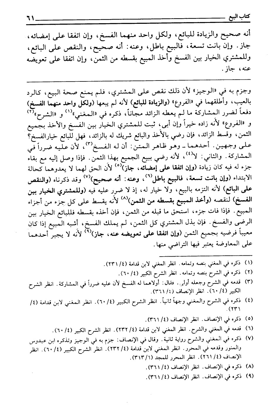 أَحَدُهُمَا: وَهُوَ ظَاهِرُ الْمَتْنِ أَنَّ لَهُ الْفَسْخَ؛ لِأَنَّ عَلَيْهِ ضَرَرًا فِي الْمُشَارَكَةِ، وَالثَّانِي: لَا؛ لِأَنَّهُ رَضِيَ بِبَيْعِ الْجَمِيعِ بِهَذَا الثَّمَنِ، فَإِذَا وَصَلَ إِلَيْهِ مَعَ بَقَاءِ جُزْءٍ لَهُ فِيهِ كَانَ زِيَادَةً (وإن اتفقا عَلَى إِمْضَائِهِ جَازَ) لِأَنَّ الْحَقَّ لَهُمَا لَا يَعْدُوهُمَا كَحَالَةِ الِابْتِدَاءِ (وَإِنْ بَانَتْ تِسْعَةً فَالْبَيْعُ بَاطِلٌ، وَعَنْهُ: أَنَّهُ صَحِيحٌ) وَقَدْ ذَكَرْنَاهُ (وَالنَّقْصُ عَلَى الْبَائِعِ) لِأَنَّهُ الْتَزَمَهُ بِالْبَيْعِ وَلَا خِيَارَ لَهُ؛ إِذْ لَا ضَرَرَ عَلَيْهِ فِيهِ (وَلِلْمُشْتَرِي الْخِيَارُ بَيْنَ الْفَسْخِ) لِنَقْصِهِ (وَأَخَذَ الْمَبِيعَ بِقِسْطِهِ مِنَ الثَّمَنِ) لِأَنَّهُ يُقَسِّطُ عَلَى كُلِّ جُزْءٍ مِنْ أَجْزَاءِ الْمَبِيعِ، فَإِذَا فَاتَ جُزْءٌ اسْتَحَقَّ مَا قَبْلَهُ مِنَ الثَّمَنِ، فَإِنْ أَخَذَهُ بِقِسْطِهِ فَلِلْبَائِعِ الْخِيَارُ بَيْنَ الرِّضَا وَالْفَسْخِ، فَإِنْ بَذَلَ الْمُشْتَرِي كُلَّ الثَّمَنِ لَمْ يَمْلُكِ الْفَسْخَ أَشْبَهَ الْمَبِيعَ إِذَا كَانَ مَعِيبًا فَرَضِيَهُ بِجَمِيعِ الثَّمَنِ (وإن اتفقا عَلَى تَعْوِيضِهِ عَنْهُ جَازَ) لِأَنَّهُ لَا يُجْبَرُ أَحَدُهُمَا عَلَى الْمُعَاوَضَةِ يُعْتَبَرُ فِيهَا التَّرَاضِيَ مِنْهَا.