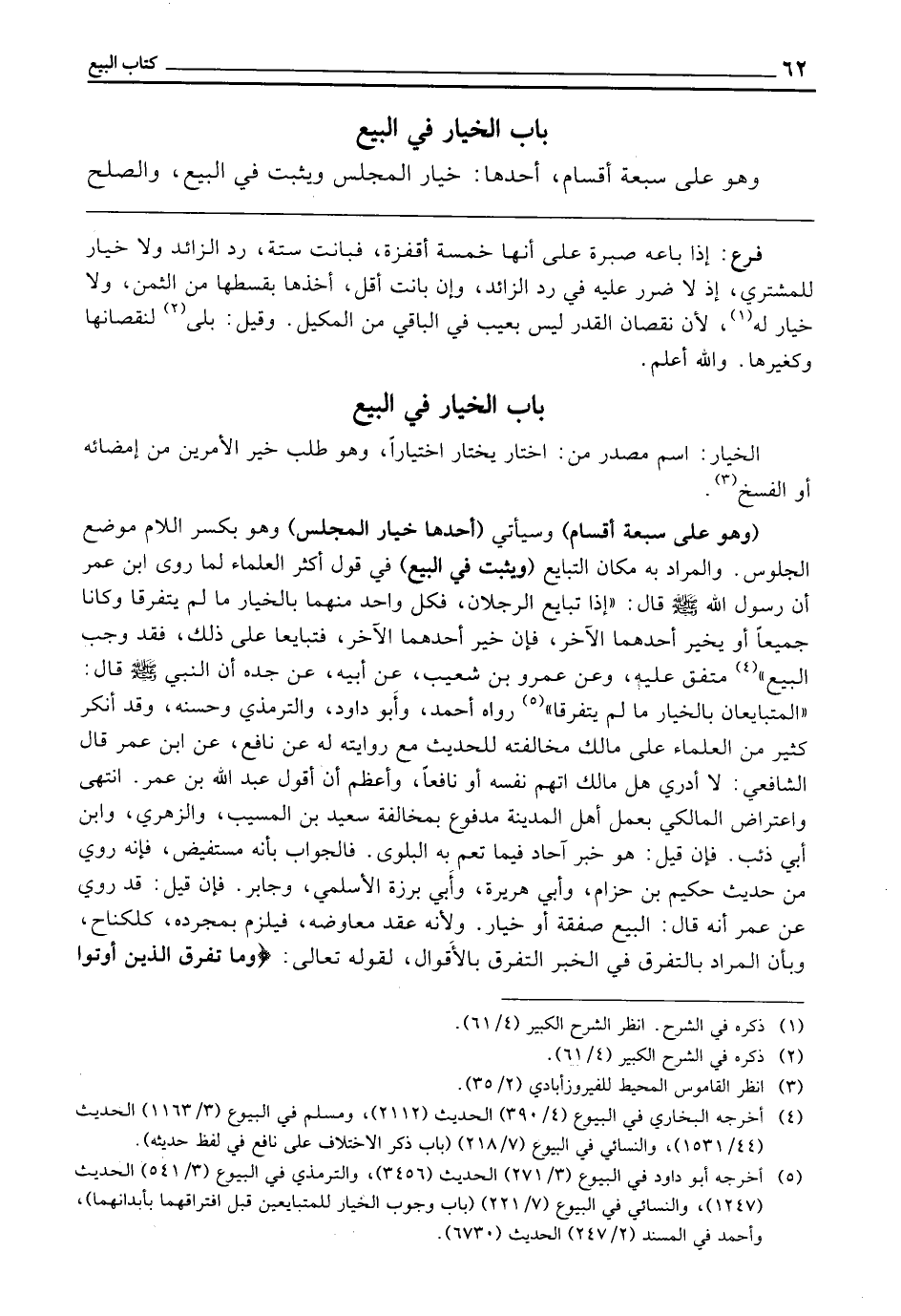 بَابُ الْخِيَارِ فِي الْبَيْعِ الْخِيَارُ: اسْمُ مَصْدَرٍ مِنِ اخْتَارَ يَخْتَارُ اخْتِيَارًا، وَهُوَ طَلَبُ خَيْرِ الْأَمْرَيْنِ مِنْ إِمْضَائِهِ أَوِ الْفَسْخِ.