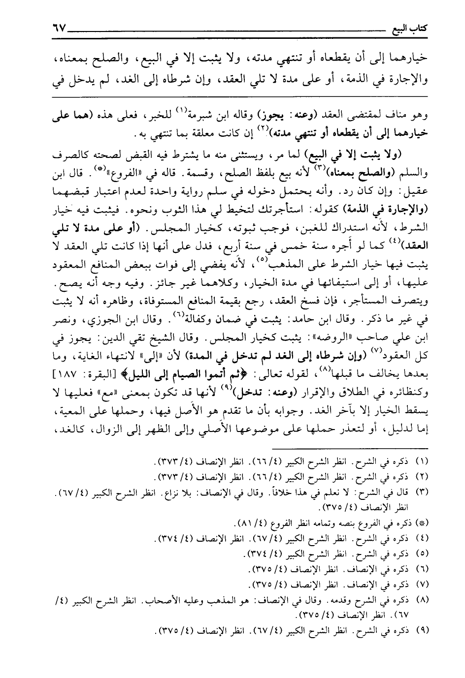 (وَلَا يَثْبُتُ إِلَّا فِي الْبَيْعِ) لِمَا مَرَّ وَيُسْتَثْنَى مِنْهُ مَا يُشْتَرَطُ فِيهِ الْقَبْضُ لِصِحَّتِهِ كَالصَّرْفِ وَالسَّلَمِ (وَالصُّلْحُ بِمَعْنَاهُ) لِأَنَّهُ بَيْعٌ بِلَفْظِ الصُّلْحِ، وَقِسْمَةٌ. قَالَهُ فِي " الْفُرُوعِ " قَالَ ابْنُ عَقِيلٍ: وَإِنْ كَانَ رَدَّ، وَأَنَّهُ يَحْتَمِلُ دُخُولَهُ فِي سِلْمٍ - رِوَايَةٌ وَاحِدَةٌ - لِعَدَمِ اعْتِبَارِ قَبْضِهِمَا (وَالْإِجَارَةِ فِي الذِّمَّةِ) كَقَوْلِهِ: اسْتَأْجَرْتُكَ لِتَخِيطَ لِي هَذَا الثَّوْبَ وَنَحْوَهُ، فَيَثْبُتُ فِيهِ خِيَارُ الشَّرْطِ؛ لِأَنَّهُ اسْتِدْرَاكٌ لِلْغَبْنِ، فَوَجَبَ ثُبُوتُهُ كَخِيَارِ الْمَجْلِسِ (أَوْ عَلَى مُدَّةٍ لَا تَلِي الْعَقْدَ) كَمَا لَوْ أَجَّرَهُ سَنَةَ خَمْسٍ فِي سَنَةِ أَرْبَعٍ فَدَلَّ عَلَى أَنَّهَا إِذَا كَانَتْ تَلِي الْعَقْدَ لَا يَثْبُتُ فِيهَا خِيَارُ الشَّرْطِ عَلَى الْمَذْهَبِ؛ لأنه يفضي إِلَى فَوَاتِ ببَعْضِ الْمَنَافِعِ الْمَعْقُودِ عَلَيْهَا، أَوْ إِلَى اسْتِيفَائِهَا فِي مُدَّةِ الْخِيَارِ؟ وكلاهما غير جَائِزٌ، وَفِيهِ وَجْهٌ أَنَّهُ يَصِحُّ وَيَتَصَرَّفُ الْمُسْتَأْجِرُ، فَإِنْ فَسَخَ الْعَقْدَ رَجَعَ بِقِيمَةِ الْمَنَافِعِ الْمُسْتَوْفَاةِ، وَظَاهِرُهُ أَنَّهُ لَا يَثْبُتُ في غير مَا ذُكِرَ، وَقَالَ ابْنُ حَامِدٍ: يَثْبُتُ فِي ضَمَانٍ وَكَفَالَةٍ. وَقَالَ ابْنُ الْجَوْزِيِّ، وَنَصْرُ بْنُ عَلِيٍّ صَاحِبُ " الرَّوْضَةِ " يَثْبُتُ كَخِيَارِ الْمَجْلِسِ، وَقَالَ الشَّيْخُ تَقِيُّ الدِّينِ: يَجُوزُ فِي كُلِّ الْعُقُودِ (وَإِنْ شَرَطَاهُ إِلَى الْغَدِ لَمْ تَدْخُلْ فِي الْمُدَّةِ) لِأَنَّ " إِلَى " لِانْتِهَاءِ الْغَايَةِ، وَمَا بَعْدَهَا يُخَالِفُ مَا قَبْلَهَا لِقَوْلِهِ تَعَالَى: {ثُمَّ أَتِمُّوا الصِّيَامَ إِلَى اللَّيْلِ} [البقرة: 187] وَكَنَظَائِرِهِ فِي الطَّلَاقِ وَالْإِقْرَارِ (وَعَنْهُ: تَدْخُلُ) لِأَنَّهَا قَدْ تَكُونُ بِمَعْنَى " مَعَ " فَعَلَيْهَا لَا يَسْقُطُ الْخِيَارُ إِلَّا بِآخِرِ الْغَدِ، وَجَوَابُهُ بِأَنَّ مَا تَقَدَّمَ هُوَ الْأَصْلُ فِيهَا، وَحَمْلُهَا عَلَى الْمَعِيَّةِ إِمَّا لِدَلِيلٍ أَوْ لِتَعَذُّرِ حَمْلِهَا عَلَى مَوْضُوعِهَا الْأَصْلِيِّ، وَإِلَى الظُّهْرِ إِلَى الزَّوَالِ كَالْغَدِ
