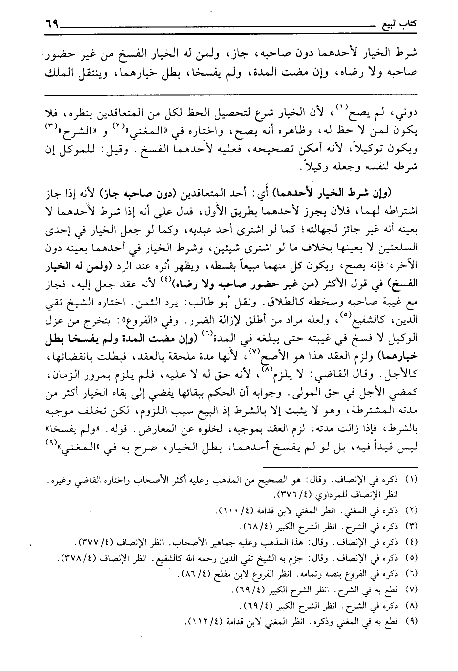 (وَإِنْ شَرَطَ الْخِيَارَ لِأَحَدِهِمَا) : أَيْ: أَحَدِ الْمُتَعَاقِدَيْنِ (دُونَ صَاحِبِهِ جَازَ) لِأَنَّهُ إِذَا جَازَ اشْتِرَاطُهُ لَهُمَا، فَلِأَنْ يَجُوزَ لِأَحَدِهِمَا بِطَرِيقِ الْأَول، فَدَلَّ عَلَى أَنَّهُ إِذَا شَرَطَ لِأَحَدِهِمَا لَا بِعَيْنِهِ أَنَّهُ غَيْرُ جَائِزٍ لِجَهَالَتِهِ، كَمَا لَوِ اشْتَرَى أَحَدٌ عَبْدَيْهِ وَكَمَا لَوْ جَعَلَ الْخِيَارَ فِي إِحْدَى السِّلْعَتَيْنِ لَا بِعَيْنِهَا بِخِلَافِ مَا لَوِ اشْتَرَى شَيْئَيْنِ، وَشَرَطَ الْخِيَارَ فِي أَحَدِهِمَا: بِعَيْنِهِ دُونَ الْآخَرِ فَإِنَّهُ يَصِحُّ وَيَكُونُ كُلٌّ مِنْهُمَا مَبِيعًا بِقِسْطِهِ وَيَظْهَرُ أَثَرُهُ عِنْدَ الرَّدِّ (وَلِمَنْ لَهُ الْخِيَارُ الْفَسْخُ) فِي قَوْلِ الْأَكْثَرِ (مِنْ غَيْرِ حُضُورِ صَاحِبِهِ وَلَا رِضَاهُ) لِأَنَّهُ عَقْدٌ جُعِلَ إِلَيْهِ، فَجَازَ مَعَ غَيْبَةِ صَاحِبِهِ وَسَخَطِهِ كَالطَّلَاقِ، وَنَقَلَ أَبُو طَالِبٍ: يَرُدُّ الثَّمَنَ، اخْتَارَهُ الشَّيْخُ تَقِيُّ الدِّينِ كَالشَّفِيعِ، وَلَعَلَّهُ مُرَادُ مَنْ أَطْلَقَ لِإِزَالَةِ الضَّرَرِ، وَفِي " الْفُرُوعِ " يَتَخَرَّجُ مَنْ عَزَلَ الْوَكِيلَ لَا فَسْخَ فِي غَيْبَتِهِ حَتَّى يُبَلِّغَهُ فِي الْمُدَّةِ (وَإِنْ مَضَتِ الْمُدَّةُ، وَلَمْ يَفْسَخَا بَطَلَ خِيَارُهُمَا) وَلَزِمَ الْعَقْدُ، هَذَا هُوَ الْأَصَحُّ، لِأَنَّهَا مُدَّةٌ مُلْحَقَةٌ بِالْعَقْدِ فَبَطَلَتْ بِانْقِضَائِهَا كَالْأَجَلِ، وَقَالَ الْقَاضِي: لَا يَلْزَمُ؛ لِأَنَّهُ حَقٌّ لَهُ لَا عَلَيْهِ، فَلَمْ يَلْزَمْ بِمُرُورِ الزَّمَانِ كَمُضِيِّ الْأَجَلِ فِي حَقِّ الْمَوْلَى، وَجَوَابُهُ أَنَّ الْحُكْمَ ببَقَائها يفضي إلى بقاء الْخِيَارِ أَكْثَرُ مِنْ مُدَّتِهِ الْمُشْتَرَطَةِ، وَهُوَ لَا يَثْبُتُ إِلَّا بِالشَّرْطِ، إِذِ الْبَيْعُ سَبَبُ اللُّزُومِ، لَكِنْ تَخَلَّفَ مُوجِبُهُ بِالشَّرْطِ، فَإِذَا زَالَتْ مُدَّتُهُ لَزِمَ الْعَقْدُ بِمُوجِبِهِ لِخُلُوِّهِ عَنِ الْمُعَارِضِ، قَوْلُهُ: " وَلَمْ يَفْسَخَا " لَيْسَ قَيْدًا فِيهِ بَلْ لَوْ لَمْ يَفْسَخْ أَحَدُهُمَا بَطَلَ الْخِيَارُ، صَرَّحَ بِهِ فِي " الْمُغْنِي "