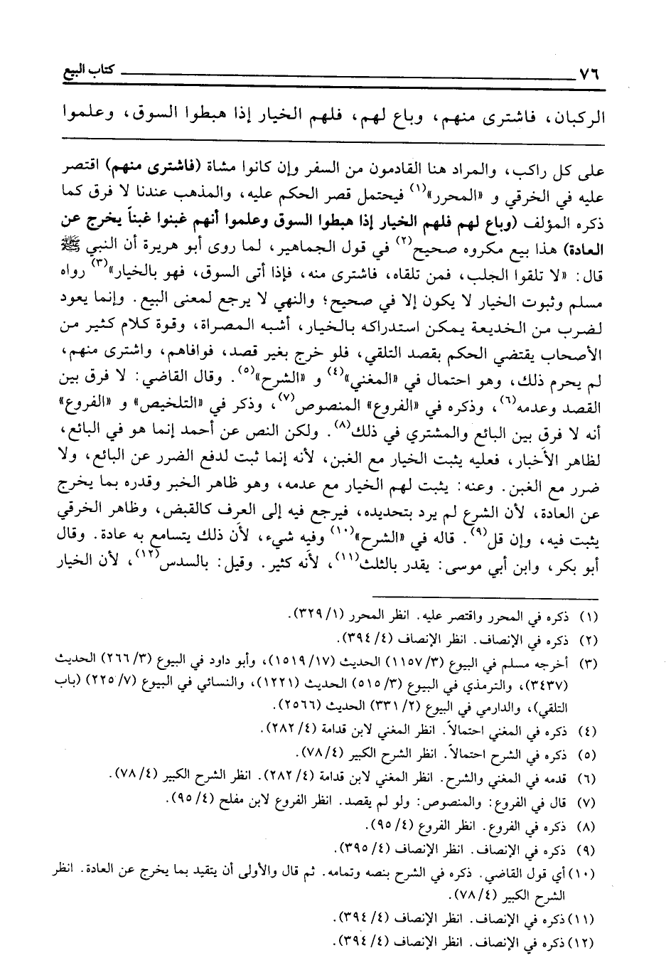 ـــــــــــــــــــــــــــــQعَلَى كُلِّ رَاكِبٍ، وَالْمُرَادُ هُنَا الْقَادِمُونَ مِنَ السَّفَرِ، وَإِنْ كَانُوا مُشَاةً (فَاشْتَرَى مِنْهُمْ) اقْتَصَرَ عَلَيْهِ فِي الْخِرَقِيِّ، وَ " الْمُحَرَّرِ " فَيُحْتَمَلُ قَصْرُ الْحُكْمِ عَلَيْهِ، وَالْمَذْهَبُ عِنْدَنَا لَا فَرْقَ، كَمَا ذَكَرَهُ الْمُؤَلِّفُ (وَبَاعَ لَهُمْ فَلَهُمُ الْخِيَارُ إِذَا هَبَطُوا السُّوقَ وَعَلِمُوا أَنَّهُمْ غُبِنُوا غَبْنًا يَخْرُجُ عَنِ الْعَادَةِ) هَذَا بَيْعٌ مَكْرُوهٌ صَحِيحٌ فِي قَوْلِ الْجَمَاهِيرِ لِمَا رَوَى أَبُو هُرَيْرَةَ أَنَّ النَّبِيَّ - صَلَّى اللَّهُ عَلَيْهِ وَسَلَّمَ - قَالَ: «لَا تَلَقُّوا الْجَلَبَ فَمَنْ تَلَقَّاهُ فَاشْتَرَى مِنْهُ، فَإِذَا أَتَى السُّوقَ فَهُوَ بِالْخِيَارِ» ، رَوَاهُ مُسْلِمٌ، وَثُبُوتُ الْخِيَارِ لَا يَكُونُ إِلَّا فِي صَحِيحٍ، وَالنَّهْيُ لَا يَرْجِعُ لِمَعْنَى الْبَيْعِ، وَإِنَّمَا يَعُودُ لِضَرْبٍ مِنَ الْخَدِيعَةِ يُمْكِنُ اسْتِدْرَاكُهُ بِالْخِيَارِ أَشْبَهَ الْمُصَرَّاةَ، وَقُوَّةُ كَلَامِ كَثِيرٍ مِنَ الْأَصْحَابِ يَقْتَضِي الْحُكْمَ بِقَصْدِ التَّلَقِّي، فَلَوْ خَرَجَ بِغَيْرِ قَصْدٍ فَوَافَاهُمْ وَاشْتَرَى مِنْهُمْ لَمْ يَحْرُمْ ذَلِكَ، وَهُوَ احْتِمَالٌ فِي " الْمُغْنِي " وَ " الشَّرْحِ "، وَقَالَ الْقَاضِي: لَا فَرْقَ بَيْنَ الْقَصْدِ وَعَدَمِهِ، وَذَكَرَهُ فِي " الْفُرُوعِ " الْمَنْصُوصِ، وَذَكَرَ فِي " التَّلْخِيصِ " وَ " الْفُرُوعِ " أَنَّهُ لَا فَرْقَ بَيْنَ الْبَائِعِ وَالْمُشْتَرِي فِي ذَلِكَ، وَلَكِنَّ النَّصَّ عَنْ أَحْمَدَ إِنَّمَا هُوَ فِي البائع، لظاهر الْأَخْبَارِ فَعَلَيْهِ يَثْبُتُ الْخِيَارُ مَعَ الْغَبْنِ؛ لِأَنَّهُ إِنَّمَا ثَبَتَ لِدَفْعِ الضَّرَرِ عَنِ الْبَائِعِ، وَلَا ضَرَرَ مَعَ الْغَبْنِ، وَعَنْهُ: يَثْبُتُ لَهُمُ الْخِيَارُ مَعَ عَدَمِهِ، وَهُوَ ظَاهِرُ الْخَبَرِ، وَقَدْرُهُ بِمَا يَخْرُجُ عَنِ الْعَادَةِ؛ لِأَنَّ الشَّرْعَ لَمْ يَرِدْ بِتَحْدِيدِهِ فَيَرْجِعُ فِيهِ إِلَى الْعُرْفِ كَالْقَبْضِ، وَظَاهِرُ الْخِرَقِيِّ يَثْبُتُ فِيهِ وَإِنْ قَلَّ، قَالَهُ فِي " الشَّرْحِ "، وَفِيهِ شَيْءٌ؛ لِأَنَّ ذَلِكَ يَتَسَامَعُ بِهِ عَادَةً، وَقَالَ أَبُو بَكْرٍ، وَابْنُ أَبِي مُوسَى يقدر بالثلث لِأَنَّهُ كَثِيرٌ، وَقِيلَ: بِالسُّدُسِ؛ لِأَنَّ الْخِيَارَ