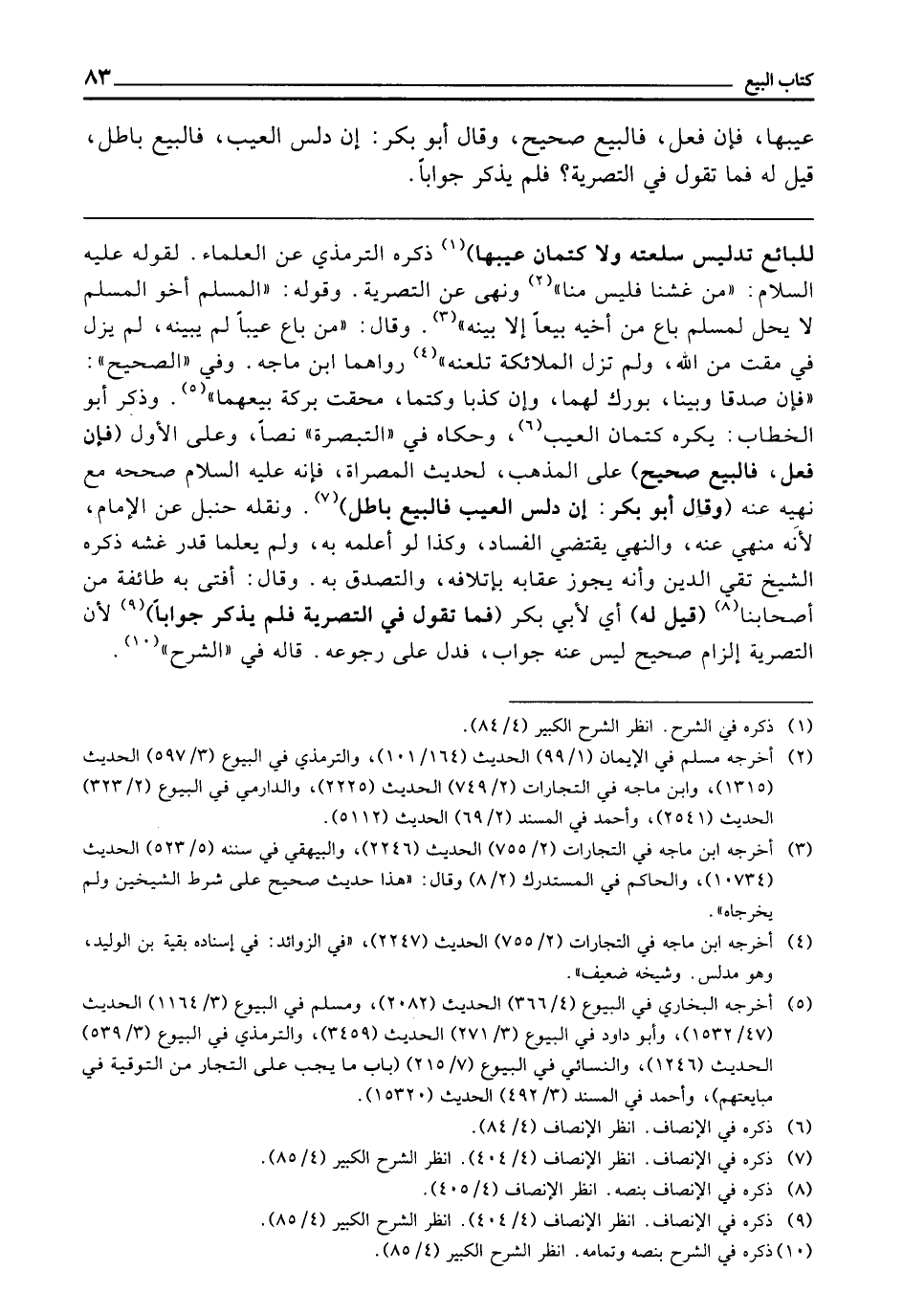 ـــــــــــــــــــــــــــــQلِلْبَائِعِ تَدْلِيسُ سِلْعَتِهِ، وَلَا كِتْمَانُ عَيْبِهَا) ذَكَرَهُ التِّرْمِذِيُّ عَنِ الْعُلَمَاءِ لِقَوْلِهِ - عَلَيْهِ السَّلَامُ -: «مَنْ غَشَّنَا فَلَيْسَ مِنَّا» وَنَهَى عَنِ التَّصْرِيَةِ، وَقَوْلُهُ: «الْمُسْلِمُ أَخُو الْمُسْلِمِ لَا يَحِلُّ لِمُسْلِمٍ بَاعَ مِنْ أَخِيهِ بَيْعًا إِلَّا بَيَّنَهُ» وَقَالَ: «مَنْ بَاعَ عَيْبًا لَمْ يُبَيِّنْهُ لَمْ يَزَلْ فِي مَقْتٍ مِنَ اللَّهِ، وَلَمْ تَزَلِ الْمَلَائِكَةُ تَلْعَنُهُ» رَوَاهُمَا ابْنُ مَاجَهْ، وَفِي " الصَّحِيحِ «فَإِنْ صَدَقَا وَبَيَّنَا بُورِكَ لَهُمَا، وَإِنْ كَذَّبَا وَكَتَمَا مُحِقَتْ بَرَكَةُ بَيْعِهِمَا» وَذَكَرَ أَبُو الْخَطَّابِ يُكْرَهُ كِتْمَانُ الْعَيْبِ وَحَكَاهُ فِي " التَّبْصِرَةِ " نصا، وَعَلَى الْأَوَّلِ: (فَإِنْ فَعَلَ فَالْبَيْعُ صَحِيحٌ) عَلَى الْمَذْهَبِ لِحَدِيثِ الْمُصَرَّاةِ، فَإِنَّهُ - عَلَيْهِ السَّلَامُ - صَحَّحَهُ مَعَ نَهْيِهِ عَنْهُ (وَقَالَ أَبُو بَكْرٍ: إِنْ دَلَّسَ الْعَيْبَ فَالْبَيْعُ بَاطِلٌ) وَنَقَلَهُ حَنْبَلٌ عَنِ الْإِمَامِ؛ لِأَنَّهُ مَنْهِيٌّ عَنْهُ، وَالنَّهْيُ يَقْتَضِي الْفَسَادَ، وَكَذَا لَوْ أَعْلَمَهُ بِهِ، وَلَمْ يَعْلَمَا قَدْرَ غِشِّهِ، ذَكَرَهُ الشَّيْخُ تَقِيُّ الدِّينِ، وَأَنَّهُ يَجُوزُ عِقَابُهُ بِإِتْلَافِهِ، وَالتَّصَدُّقِ بِهِ، وَقَالَ: أَفْتَى بِهِ طَائِفَةٌ مِنْ أَصْحَابِنَا (قِيلَ لَهُ) أَيْ: لِأَبِي بَكْرٍ (فَمَا تَقُولُ فِي التَّصْرِيَةِ؟ فَلَمْ يَذْكُرْ جَوَابًا) لِأَنَّ التَّصْرِيَةَ إِلْزَامٌ صَحِيحٌ لَيْسَ عَنْهُ جَوَابٌ، فَدَلَّ عَلَى رُجُوعِهِ، قَالَهُ فِي " الشَّرْحِ ".