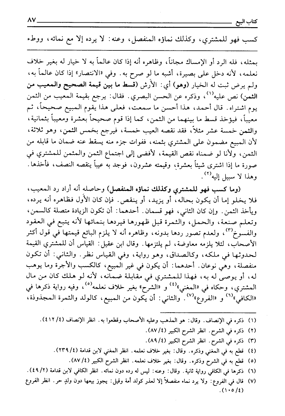 (وَمَا كَسَبَ فَهُوَ لِلْمُشْتَرِي وَكَذَلِكَ نَمَاؤُهُ الْمُنْفَصِلُ) وَحَاصِلُهُ أَنَّهُ إِذَا أَرَادَ رَدَّ الْمَعِيبِ، فَلَا يَخْلُو إِمَّا أَنْ يَكُونَ بِحَالِهِ أَوْ يَزِيدَ أَوْ يَنْقُصَ، فَإِنْ كَانَ الْأَوَّلُ فَظَاهِرُهُ أَنَّهُ يَرُدُّهُ وَيَأْخُذُ الثَّمَنَ، وَإِنْ كَانَ الثَّانِي فَهُوَ قِسْمَانِ: