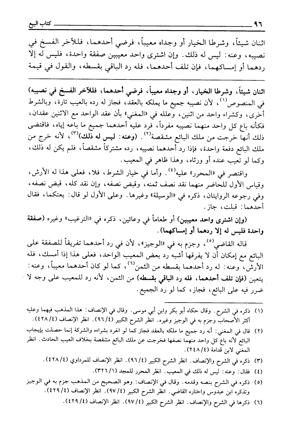 اثْنَانِ شَيْئًا، وَشَرَطَا الْخِيَارَ، أَوْ وَجَدَاهُ مَعِيبًا فَرَضِيَ أَحَدُهُمَا، فَلِلْآخَرِ الْفَسْخُ فِي نَصِيبِهِ، وَعَنْهُ: لَيْسَ لَهُ ذَلِكَ، وَإِنِ اشْتَرَى وَاحِدٌ مَعِيبَيْنِ صَفْقَةً وَاحِدَةً فَلَيْسَ لَهُ إِلَّا رَدُّهُمَا أَوْ إِمْسَاكَهُمَا، فَإِنْ تَلِفَ أَحَدُهُمَا: فَلَهُ رَدُّ الْبَاقِي بِقِسْطِهِ، وَالْقَوْلُ فِي قِيمَةِ