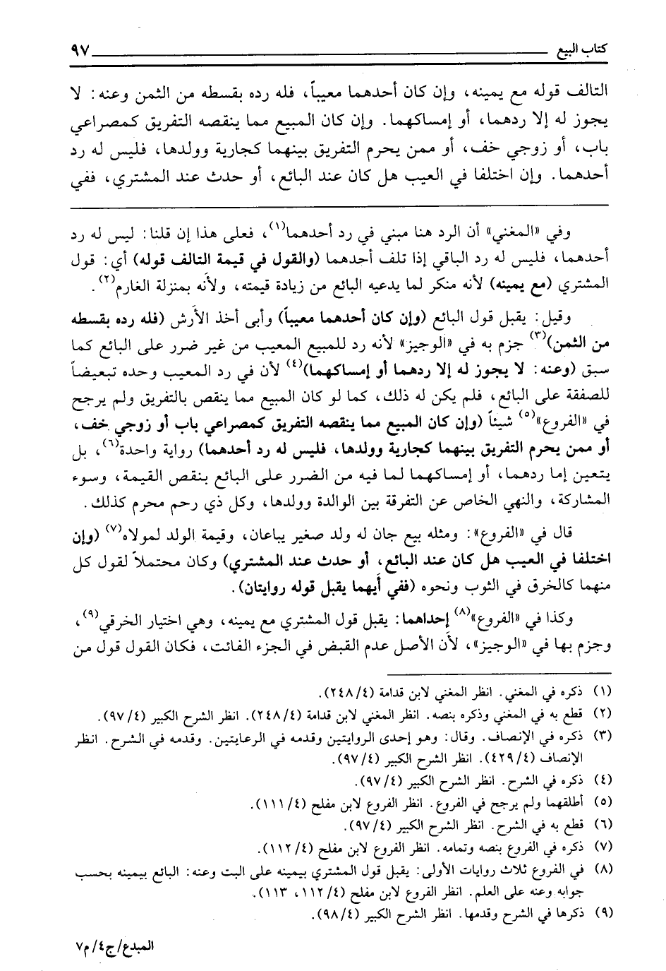 التَّالِفِ قَوْلُهُ مَعَ يَمِينِهِ، وَإِنْ كَانَ أَحَدُهُمَا مَعِيبًا فَلَهُ رَدُّهُ بِقِسْطِهِ مِنَ الثَّمَنِ، وَعَنْهُ: لَا يَجُوزُ لَهُ إِلَّا رَدُّهُمَا أَوْ إِمْسَاكُهُمَا، وَإِنْ كَانَ الْمَبِيعُ مِمَّا يَنْقُصُهُ التَّفْرِيقُ كَمِصْرَاعَيْ بَابٍ أو زَوْجَيْ خُفٍّ، أَوْ مَنْ يَحْرُمُ التَّفْرِيقُ بَيْنَهُمَا كَجَارِيَةٍ وَوَلَدِهَا، فَلَيْسَ لَهُ رَدُّ أَحَدِهِمَا. وَإِنِ اخْتَلَفَا بِالْعَيْبِ، هَلْ كَانَ عِنْدَ الْبَائِعِ أَوْ حَدَثَ عِنْدَ الْمُشْتَرِي، فَفِي