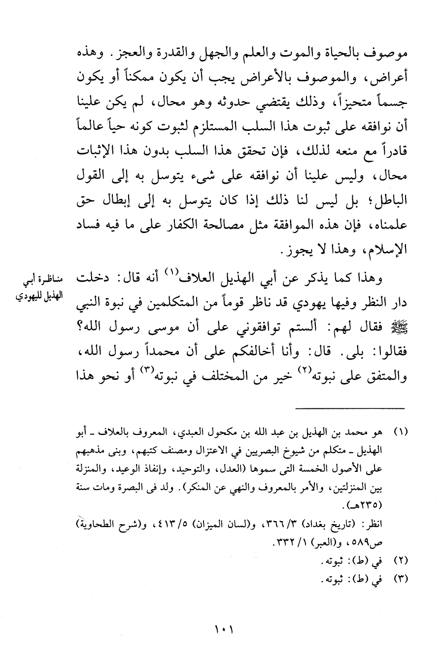 موصوف بالحياة والموت والعلم والجهل والقدرة والعجز وهذه أعراض والموصوف بالأعراض يجب أن يكون ممكناً أو يكون جسماً متحيزاً وذلك يقتضي حدوثه وهو محال لم يكن علينا أن نوافقه على ثبوت هذا السلب المستلزم لثبوت كونه حياً عالماً قادراً مع منعه لذلك فإن تحقق هذا السلب بدون هذا الإثبات محال وليس علينا أن نوافقه على شيء يتوسل به إلى القول الباطل بل ليس لنا ذلك إذا كان يتوسل به إلى إبطال حق علمناه فإن هذه الموافقة مثل مصالحة الكفار على ما فيه فساد الإسلام وهذا لا يجوز وهذا كما يذكر عن أبي الهذيل العلاف أنه قال دخلت دار النظر وفيها يهودي قد ناظر قوماً من المتكلمين في نبوة النبي صلى الله عليه وسلم فقال لهم ألستم توافقوني على أن موسى رسول الله فقالوا بلى قال وأنا أخالفكم على أن محمداً رسول الله والمتفق على نبوته خير من المختلف في نبوته أو نحو هذا