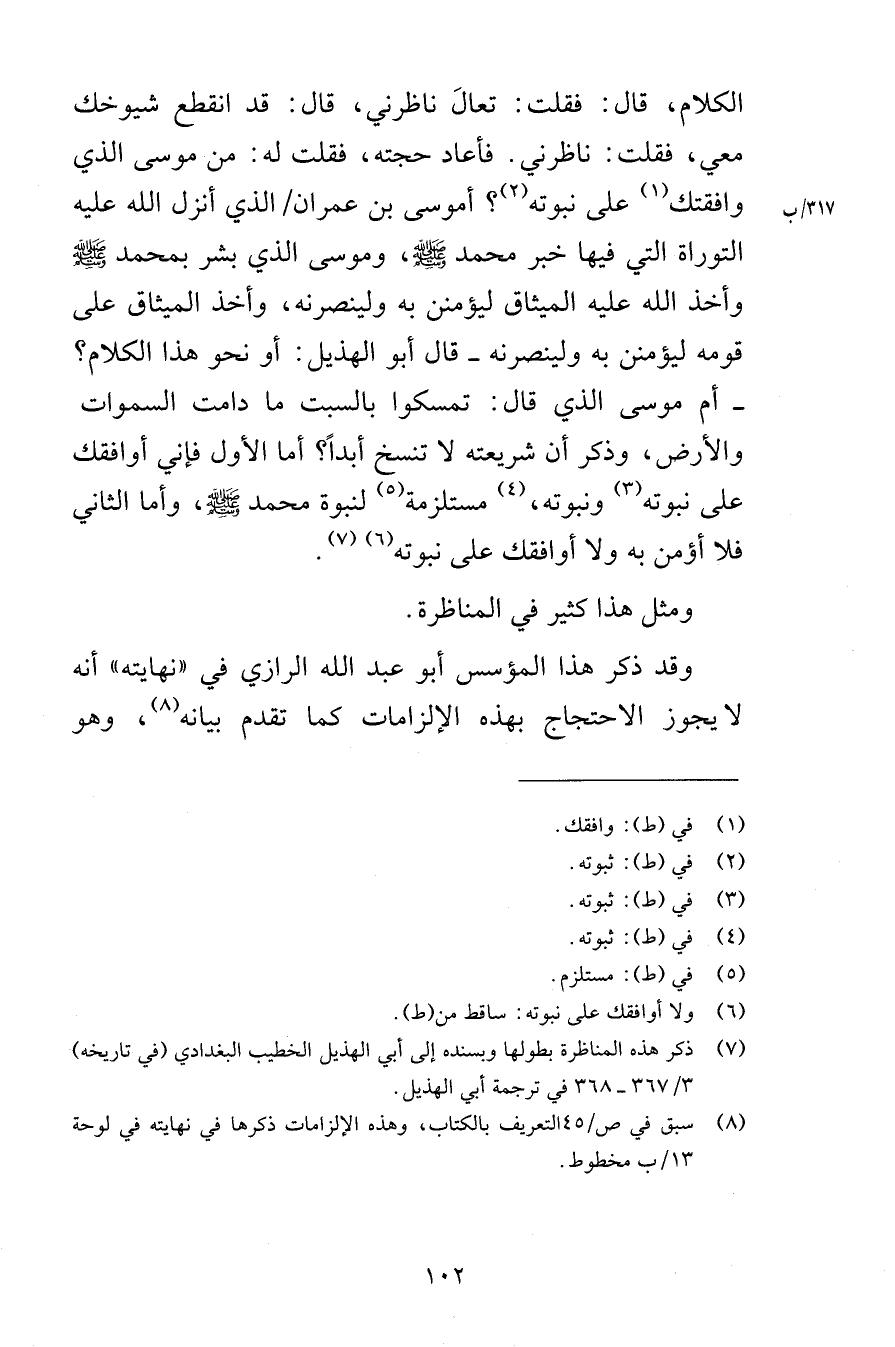 الكلام قال فقلت تعالَ ناظرني قال قد انقطع شيوخك معي فقلت ناظرني فأعاد حجته فقلت له من موسى الذي وافقتك على نبوته أموسى بن عمران الذي أنزل الله عليه التوراة التي فيها خبر محمد صلى الله عليه وسلم وموسى الذي بشر بمحمد صلى الله عليه وسلم وأخذ الله عليه الميثاق ليؤمن نبه ولينصرنه وأخذ الميثاق على قومه ليؤمن نبه ولينصرنه قال أبو الهذيل أو نحو هذا الكلام أم موسى الذي قال تمسكوا بالسبت ما دامت السموات والأرض وذكر أن شريعته لا تنسخ أبداً أما الأول فإني أوافقك على نبوته ونبوته مستلزمة لنبوة محمد صلى الله عليه وسلم وأما الثاني فلا أؤمن به ولا أوافقك على نبوته ومثل هذا كثير في المناظرة وقد ذكر هذا المؤسس أبو عبد الله الرازي في نهايته أنه لا يجوز الاحتجاج بهذه الإلزامات كما تقدم بيانه وهو
