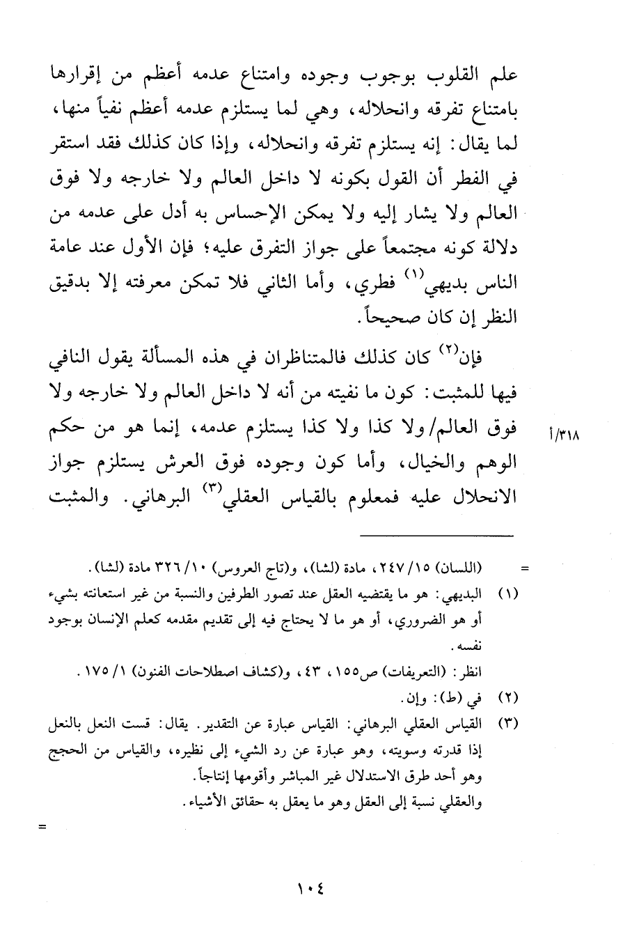 علم القلوب بوجوب وجوده وامتناع عدمه أعظم من إقرارها بامتناع تفرقه وانحلاله وهي لما يستلزم عدمه أعظم نفياً منها لما يقال إنه يستلزم تفرقه وانحلاله وإذا كان كذلك فقد استقر في الفطر أن القول بكونه لا داخل العالم ولا خارجه ولا فوق العالم ولا يشار إليه ولا يمكن الإحساس به أدل على عدمه من دلالة كونه مجتمعاً على جواز التفرق عليه فإن الأول عند عامة الناس بديهي فطري وأما الثاني فلا تمكن معرفته إلا بدقيق النظر إن كان صحيحاً فإن كان كذلك فالمتناظران في هذه المسألة يقول النافي فيها للمثبت كون ما نفيته من أنه لا داخل العالم ولا خارجه ولا فوق العالم ولا كذا ولا كذا يستلزم عدمه إنما هو من حكم الوهم والخيال وأما كون وجوده فوق العرش يستلزم جواز الانحلال عليه فمعلوم بالقياس العقلي البرهاني والمثبت