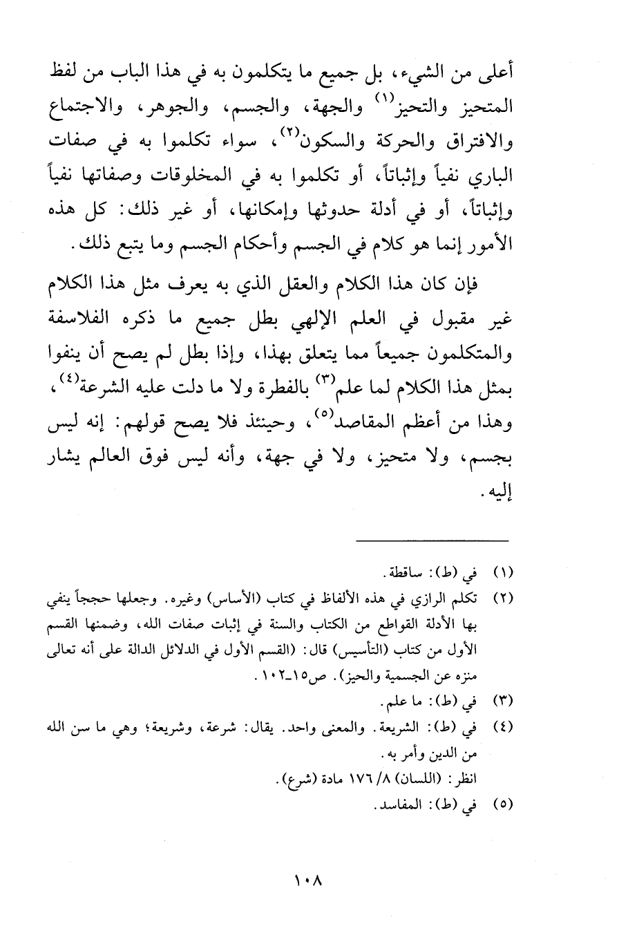 أعلى من الشيء بل جميع ما يتكلمون به في هذا الباب من لفظ المتحيز والتحيز والجهة والجسم والجوهر والاجتماع والافتراق والحركة والسكون سواء تكلموا به في صفات الباري نفياً وإثباتاً أو تكلموا به في المخلوقات وصفاتها نفياً وإثباتاً أو في أدلة حدوثها وإمكانها أو غير ذلك كل هذه الأمور إنما هو كلام في الجسم وأحكام الجسم وما يتبع ذلك فإن كان هذا الكلام والعقل الذي يعرف به مثل هذا الكلام غير مقبول في العلم الإلهي بطل جميع ما ذكره الفلاسفة والمتكلمون جميعاً مما يتعلق بهذا وإذا بطل لم يصح أن ينفوا بمثل هذا الكلام لما علم بالفطرة ولا ما دلت عليه الشرعة وهذا من أعظم المقاصد وحينئذ فلا يصح قولهم إنه ليس بجسم ولا متحيز ولا في جهة وأنه ليس فوق العالم يشار إليه