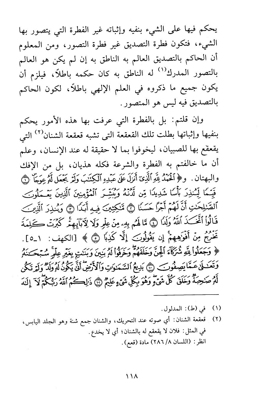 يحكم فيها على الشيء بنفيه وإثباته غير الفطرة التي يتصور بها الشيء فتكون فطرة التصديق غير فطرة التصور ومن المعلوم أن الحاكم بالتصديق العالم به الناطق به إن لم يكن هو العالم بالتصور المدرك له الناطق به كان حكمه باطلاً فيلزم أن يكون جميع ما ذكروه في العلم الإلهي باطلاً لكون الحاكم بالتصديق فيه ليس هو المتصور وإن قلتم بل بالفطرة التي عرفت بها هذه الأمور يحكم بنفيها أو إثباتها بطلت تلك القعقعة التي تشبه قعقعة الشنان التي يقعقع بها للصبيان ليخوفوا بما لا حقيقة له عند الإنسان وعلم أن ما خالفتم به الفطرة والشرعة فكله هذيان بل من الإفك والبهتان الْحَمْدُ لِلَّهِ الَّذِي أَنزَلَ عَلَى عَبْدِهِ الْكِتَابَ وَلَمْ يَجْعَل لَّهُ عِوَجَا {1} قَيِّماً لِّيُنذِرَ بَأْساً شَدِيداً مِن لَّدُنْهُ وَيُبَشِّرَ الْمُؤْمِنِينَ الَّذِينَ يَعْمَلُونَ الصَّالِحَاتِ أَنَّ لَهُمْ أَجْراً حَسَناً {2} مَاكِثِينَ فِيهِ أَبَداً {3} وَيُنذِرَ الَّذِينَ قَالُوا اتَّخَذَ اللَّهُ وَلَداً {4} مَّا لَهُم بِهِ مِنْ عِلْمٍ وَلَا لِآبَائِهِمْ كَبُرَتْ كَلِمَةً تَخْرُجُ مِنْ أَفْوَاهِهِمْ إِن يَقُولُونَ إِلَّا كَذِباً {5} [الكهف 1-5] وَجَعَلُواْ لِلّهِ شُرَكَاء الْجِنَّ وَخَلَقَهُمْ وَخَرَقُواْ لَهُ بَنِينَ وَبَنَاتٍ بِغَيْرِ عِلْمٍ سُبْحَانَهُ وَتَعَالَى عَمَّا يَصِفُونَ {100} بَدِيعُ السَّمَاوَاتِ وَالأَرْضِ أَنَّى يَكُونُ لَهُ وَلَدٌ وَلَمْ تَكُن لَّهُ صَاحِبَةٌ وَخَلَقَ كُلَّ شَيْءٍ وهُوَ بِكُلِّ شَيْءٍ عَلِيمٌ {101} ذَلِكُمُ اللهُ رَبُّكُمْ لا إِلَهَ