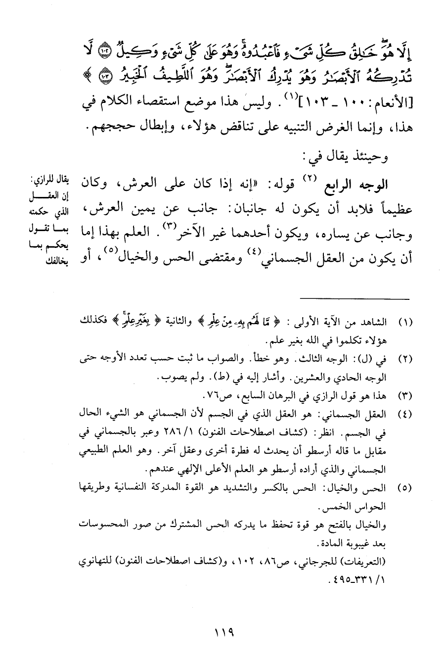 إِلاَّ هُوَ خَالِقُ كُلِّ شَيْءٍ فَاعْبُدُوهُ وَهُوَ عَلَى كُلِّ شَيْءٍ وَكِيلٌ {102} لاَّ تُدْرِكُهُ الأَبْصَارُ وَهُوَ يُدْرِكُ الأَبْصَارَ وَهُوَ اللَّطِيفُ الْخَبِيرُ {103} [الأنعام 100-103] وليس هذا موضع استقصاء الكلام في هذا وإنما الغرض التنبيه على تناقض هؤلاء وإبطال حججهم وحينئذ يقال في الوجه الرابع قوله إنه إذا كان على العرش وكان عظيماً فلابد أن يكون له جانبان جانب عن يمين العرش وجانب عن يساره ويكون أحدهما غير الآخر العلم بهذا إما أن يكون من العقل الجسماني ومقتضى الحس والخيال أو