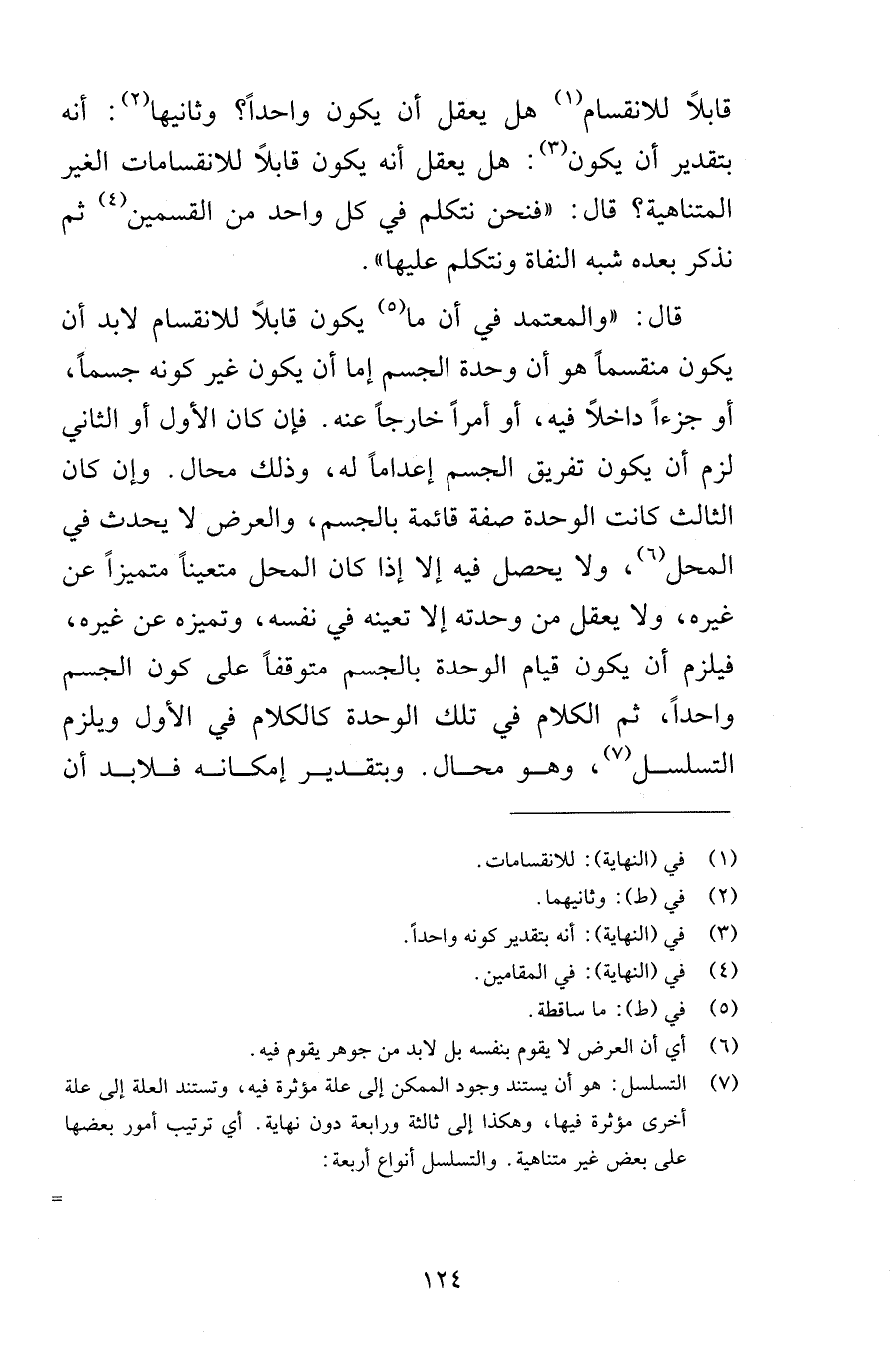 قابلاً للانقسام هل يعقل أن يكون واحداً وثانيها أنه بتقدير أن يكون هل يعقل أنه يكون قابلاً للانقسامات الغير المتناهية قال فنحن نتكلم في كل واحد من القسمين ثم نذكر بعده شبه النفاة ونتكلم عليها قال والمعتمد في أن ما يكون قابلاً للانقسام لابد أن يكون منقسماً هو أن وحدة الجسم إما أن يكون غير كونه جسماً أو جزءاً داخلاً فيه أو أمراً خارجاً عنه فإن كان الأول أو الثاني لزم أن يكون تفريق الجسم إعداماً له وذلك محال وإن كان الثالث كانت الوحدة صفة قائمة بالجسم والعرض لا يحدث في المحل ولا يحصل فيه إلا إذا كان المحل متعيناً متميزاً عن غيره ولا يعقل من وحدته إلا تعينه في نفسه وتميزه عن غيره فيلزم أن يكون قيام الوحدة بالجسم متوقفاً على كون الجسم واحداً ثم الكلام في تلك الوحدة كالكلام في الأول ويلزم التسلسل وهو محال وبتقدير إمكانه فلابد أن