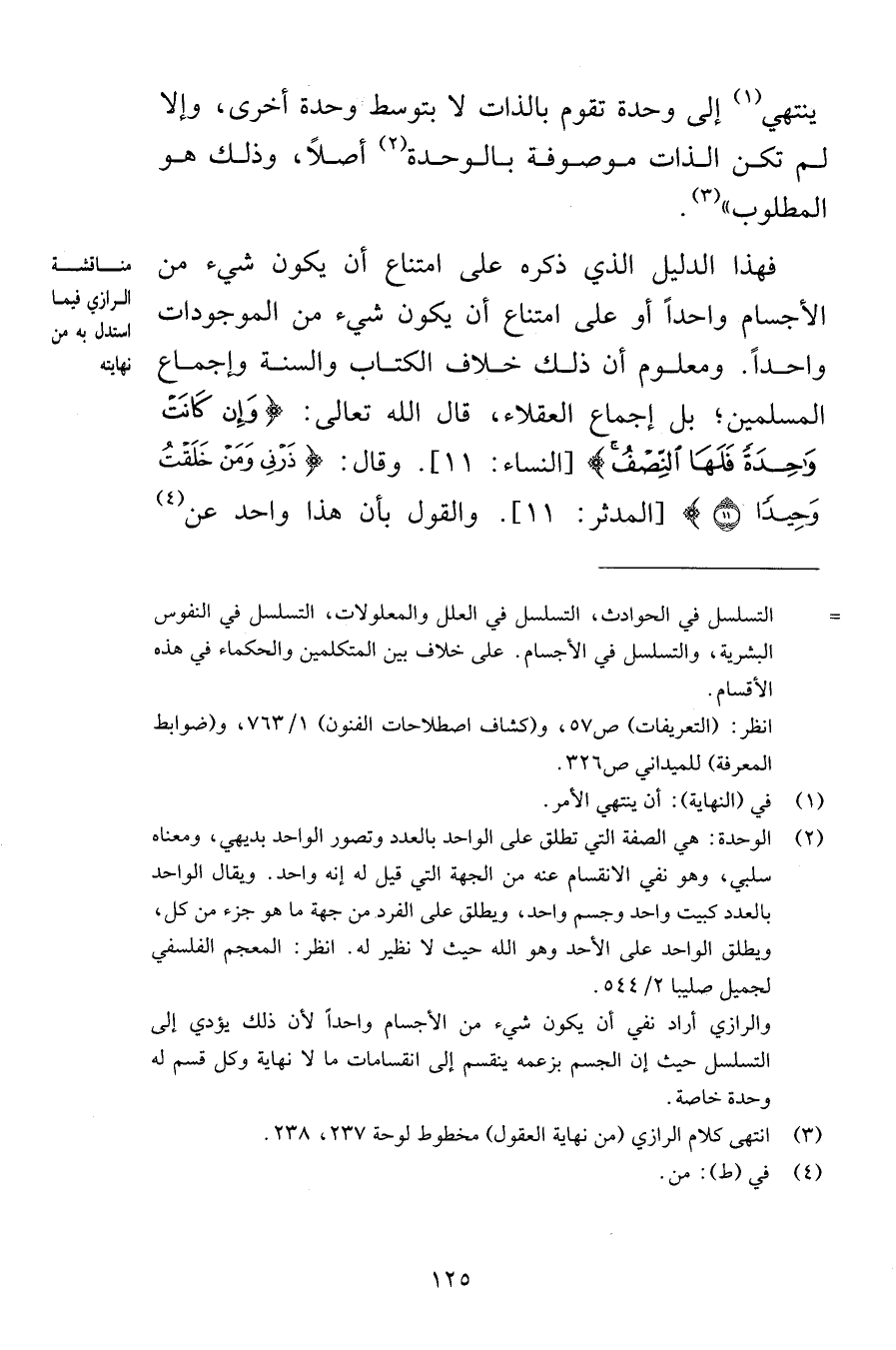 ينتهي إلى وحدة تقوم بالذات لا بتوسط وحدة أخرى وإلا لم تكن الذات موصوفة بالوحدة أصلاً وذلك هو المطلوب فهذا الدليل الذي ذكره على امتناع أن يكون شيء من الأجسام واحداً أو على امتناع أن يكون شيء من الموجودات واحداً ومعلوم أن ذلك خلاف الكتاب والسنة وإجماع المسلمين بل إجماع العقلاء قال الله تعالى وَإِن كَانَتْ وَاحِدَةً فَلَهَا النِّصْفُ [النساء 11] وقال ذَرْنِي وَمَنْ خَلَقْتُ وَحِيداً {11} [المدثر 11] والقول بأن هذا واحد عن