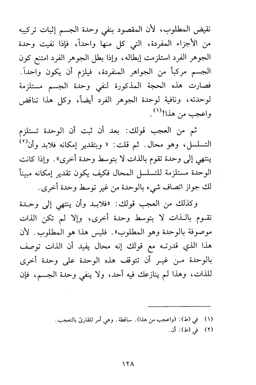 نقيض المطلوب لأن المقصود بنفي وحدة الجسم إثبات تركيبه من الأجزاء المفردة التي كل منها واحداً فإذا نفيت وحدة الجوهر الفرد استلزمت إبطاله وإذا بطل الجوهر الفرد امتنع كون الجسم مركباً من الجواهر المنفردة فيلزم أن يكون واحداً فصارت هذه الحجة المذكورة لنفي وحدة الجسم مستلزمة لوحدته ونافية لوحدة الجوهر الفرد أيضاً وكل هذا تناقض واعجب من هذا ثم من العجب قولك بعد أن ثبت أن الوحدة تستلزم التسلسل وهو محال ثم قلت وبتقدير إمكانه فلابد وأن ينتهي إلى وحدة تقوم بالذات لا بتوسط وحدة أخرى وإذا كانت الوحدة مستلزمة للتسلسل المحال فكيف يكون تقدير إمكانه مبيناً لك جواز اتصاف شيء بالوحدة من غير توسط وحدة أخرى وكذلك من العجب قولك فلابد وأن ينتهي إلى وحدة تقوم بالذات لا بتوسط وحدة أخرى وإلا لم تكن الذات موصوفة بالوحدة وهو المطلوب فليس هذا هو المطلوب لأن هذا الذي قدرته مع قولك إنه محال يفيد أن الذات توصف بالوحدة من غير أن تتوقف هذه الوحدة على وحدة أخرى للذات وهذا لم ينازعك فيه أحد ولا ينفي وحدة الجسم فإن