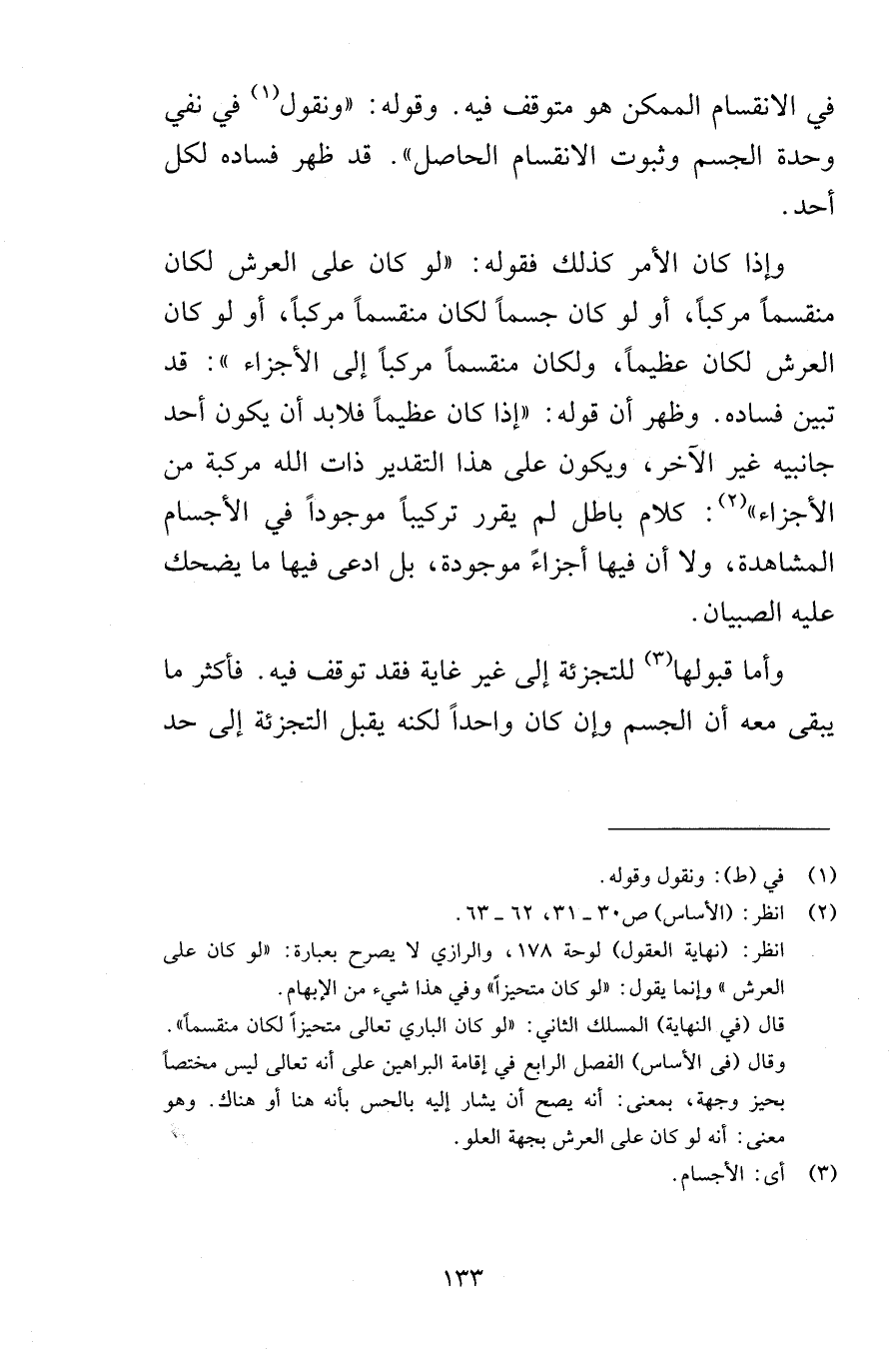 في الانقسام الممكن هو متوقف فيه وقوله ونقول في نفي وحدة الجسم وثبوت الانقسام الحاصل قد ظهر فساده لكل أحد وإذا كان الأمر كذلك فقوله لو كان على العرش لكان منقسماً مركباً أو لكان جسماً لكان منقسماً مركباً أو لو كان العرش لكان عظيماً ولكان منقسماً مركباً إلى الأجزاء قد تبين فساده وظهر أن قوله إذا كان عظيماً فلابد أن يكون أحد جانبيه غير الآخر ويكون على هذا التقدير ذات الله مركبة من الجزاء كلام باطل لم يقرر تركيباً موجوداً في الأجسام المشاهدة ولا أن فيها أجزاءً موجودة بل ادعى فيها ما يضحك عليه الصبيان وأما قبولها للتجزئة إلى غير غاية فقد توقف فيه فأكثر ما يبقى معه أن الجسم وإن كان واحداً لكنه يقبل التجزئة إلى حد