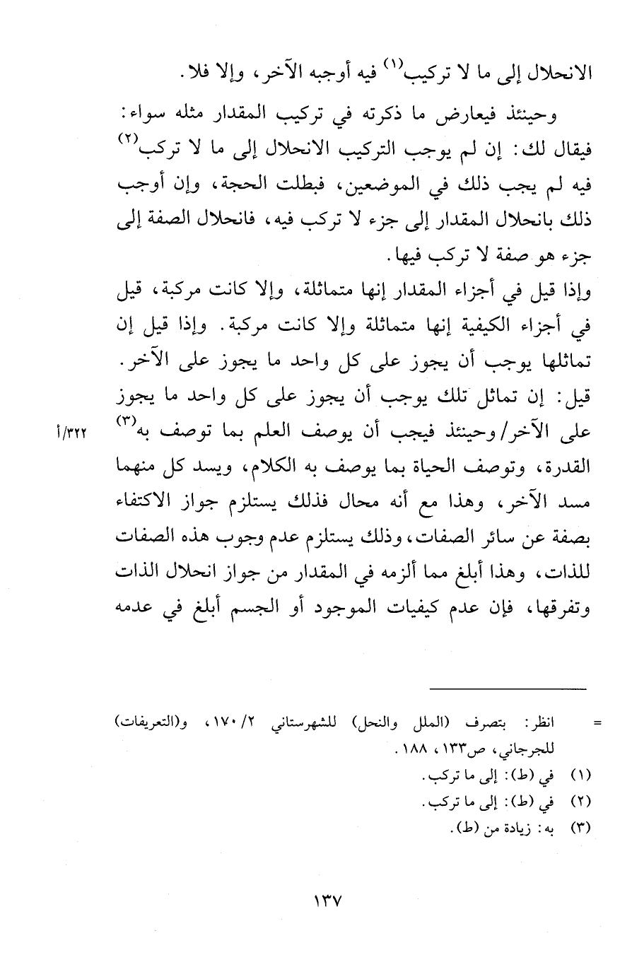 الانحلال إلى ما لا تركيب فيه أوجبه الآخر وإلا فلا وحينئذ فيعارض ما ذكرته في تركيب المقدار مثله سواء فيقال لك إن لم يوجب التركيب والانحلال إلى ما لا تركب فيه لم يجب ذلك في الموضعين فبطلت الحجة وإن أوجب ذلك بانحلال المقدار إلى جزء لا تركب فيه فانحلال الصفة إلى جزء هو صفة لا تركب فيها وإذا قيل في أجزاء المقدار إنها متماثلة وإلا كانت مركبة قيل في أجزاء الكيفية إنها متماثلة وإلا كانت مركبة وإذا قيل إن تماثلها يوجب أن يجوز على كل واحد ما يجوز على الآخر قيل إن تماثل تلك يوجب أن يجوز على كل واحد ما يجوز على الآخر وحينئذ فيجب أن يوصف العلم بما توصف به القدرة وتوصف الحياة بما يوصف به الكلام ويسد كل منهما مسد الآخر وهذا مع أنه محال فذلك يستلزم جواز الاكتفاء بصفة عن سائر الصفات وذلك يستلزم عدم وجوب هذه الصفات للذات وهذا أبلغ مما ألزمه في المقدار من جواز انحلال الذات وتفرقها فإن عدم كيفيات الموجود أو الجسم أبلغ في عدمه
