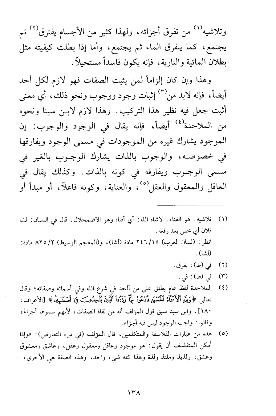 وتلاشيه من تفرق أجزائه ولهذا كثير من الأجسام يفترق ثم يجتمع كما يتفرق الماء ثم يجتمع وأما إذا بطلت كيفيته مثل بطلان المائية والنارية فإنه يكون فاسداً مستحيلاً وهذا وإن كان إلزاماً لمن يثبت الصفات فهو لازم لكل أحد أيضاً فإنه لابد من إثبات وجود ووجوب ونحو ذلك أي معنى أثبت جعل فيه نظير هذا التركيب وهذا لازم لابن سينا ونحوه من الملاحدة أيضاً فإنه يقال في الوجود والوجوب إن الموجود يشارك غيره من الموجودات في مسمى الوجود ويفارقها في خصوصه والوجوب بالذات يشارك الوجوب بالغير في مسمى الوجوب ويفارقه في كونه بالذات وكذلك يقال في العاقل والمعقول والعقل والعناية وكونه فاعلاً أو مبدأ أو