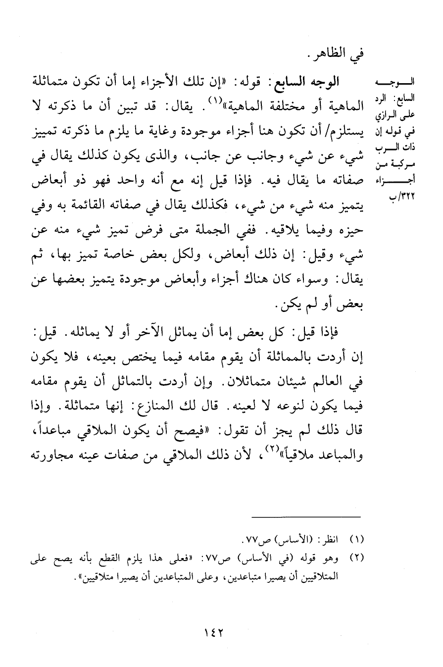 في الظاهر الوجه السابع قوله إن تلك الأجزاء إما أن تكون متماثلة الماهية أو مختلفة الماهية يقال قد تبين أن ما ذكرته لا يستلزم أن تكون هنا أجزاء موجودة وغاية ما يلزم ما ذكرته تمييز شيء عن شيء وجانب عن جانب والذي يكون كذلك يقال في صفاته ما يقال فإذا قيل إنه مع أنه واحد فهو ذو أبعاض يتميز منه شيء من شيء فكذلك يقال في صفاته القائمة به وفي حيزه وفيما يلاقيه ففي الجملة متى فرض تميز شيء منه عن شيء وقيل إن ذلك أبعاض ولكل بعض خاصة تميز بها ثم يقال وساء كان هناك أجزاء وأبعاض موجودة يتميز بعضها عن بعض أو لم يكن فإذا قيل كل بعض إما أن يماثل الآخر أو لا يماثله قيل إن أردت بالمماثلة أن يقوم مقامه فيما يختص بعينه فلا يكون في العالم شيئان متماثلان وإن أردت بالتماثل أن يقوم مقامه فيما يكون لنوعه لا لعينه قال لك المنازع إنها متماثلة وإذا قال ذلك لم يجز أن تقول فيصح أن يكون الملاقي مباعداً والمباعد ملاقياً لأن ذلك الملاقي في صفات عينه مجاورته