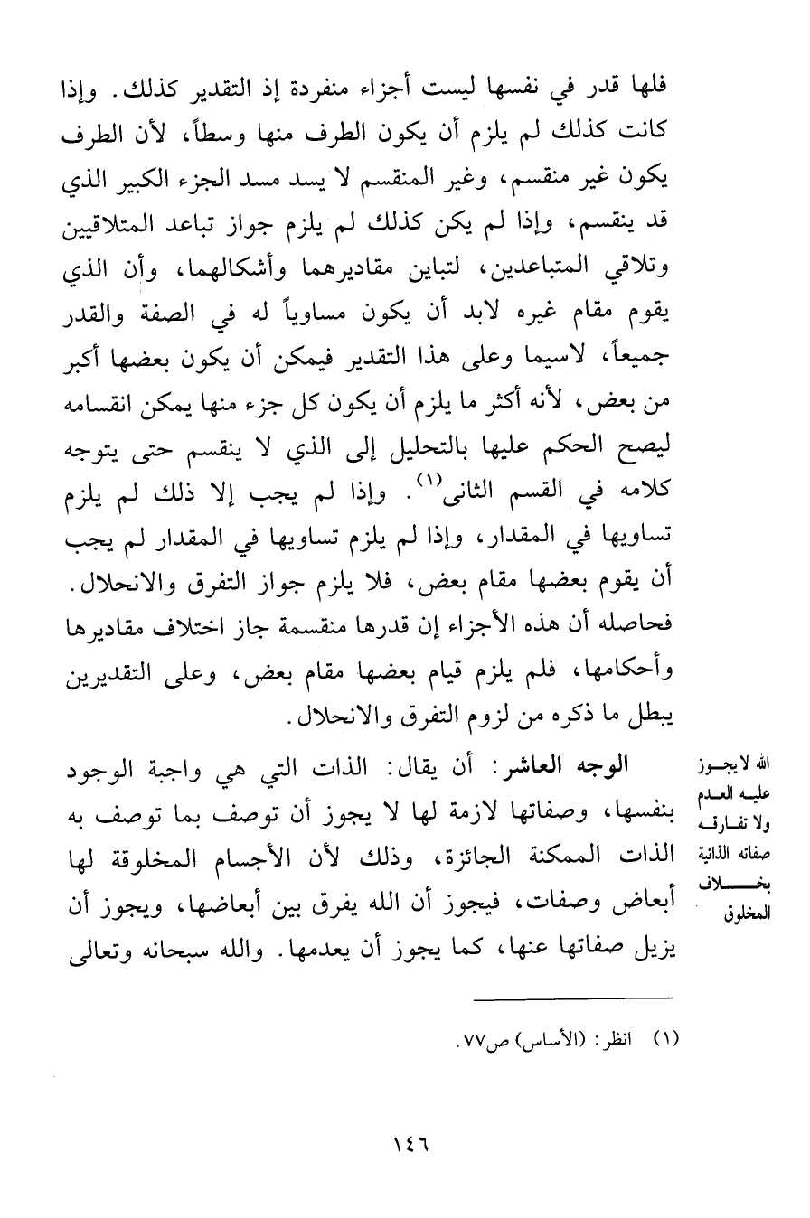 فلها قدر في نفسها ليست أجزاء منفردة إذ التقدير كذلك وإذا كانت كذلك لم يلزم أن يكون الطرف منها وسطاً لأن الطرف يكون غير منقسم وغير المنقسم لا يسد مسد الجزء الكبير الذي قد ينقسم وإذا لم يكن كذلك لم يلزم جواز تباعد المتلاقيين وتلاقي المتباعدين لتباين مقاديرهما وأشكالهما وأن الذي يقوم مقام غيره لابد أن يكون مساوياً له في الصفة والقدر جميعاً لاسيما وعلى هذا التقدير فيمكن أن يكون بعضها أكبر من بعض لأنه أكثر ما يلزم أن يكون كل جزء منها يمكن انقسامه ليصح الحكم عليها بالتحليل إلى الذي لا ينقسم حتى يتوجه كلامه في القسم الثاني وإذا لم يجب إلا ذلك لم يلزم تساويها في المقدار وإذا لم يلزم تساويها في المقدار لم يجب أن يقوم بعضها مقام بعض فلا يلزم جواز التفرق والانحلال فحاصله أن هذه الأجزاء إن قدرها منقسمة جاز اختلاف مقاديرها وأحكامها قلم يلزم قيام بعضها مقام بعض وعلى التقديرين يبطل ما ذكره من لزوم التفرق والانحلال الوجه العاشر أن يقال الذات التي هي واجبة الوجود بنفسها وصفاتها لازمة لها لا يجوز أن توصف بما توصف به الذات الممكنة الجائزة وذلك لأن الأجسام المخلوقة لها أبعاض وصفات فيجوز أن الله يفرق بين أبعاضها ويجوز أن يزيل صفاتها عنها كما يجوز أن يعدمها والله سبحانه وتعالى