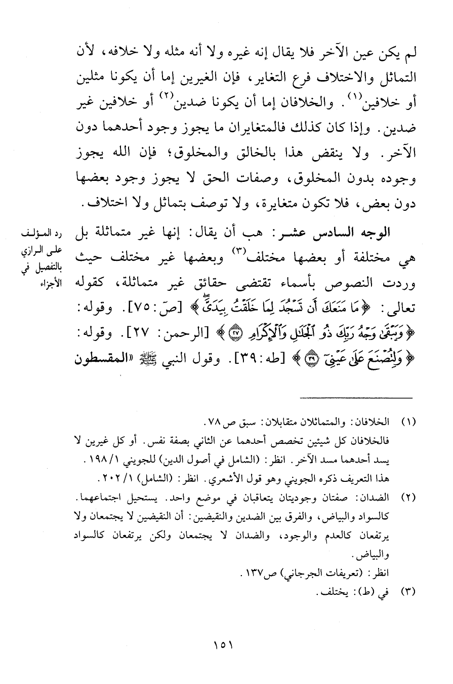 لم يكن عين الآخر فلا يقال إنه غيره ولا أنه مثله ولا خلافه لأن التماثل والاختلاف فرع التغاير فإن الغيرين إما أن يكونا مثلين أو خلافين والخلافان إما أن يكونا ضدين أو خلافين غير ضدين وإذا كان كذلك فالمتغايران ما يجوز وجود أحدهما دون الآخر ولا ينقض هذا بالخالق والمخلوق فإن الله يجوز وجوده بدون المخلوق وصفات الحق لا يجوز وجود بعضها دون بعض فلا تكون متغايرة ولا توصف بتماثل ولا اختلاف الوجه السادس عشر هب أن يقال إنها غير متماثلة بل هي مختلفة أو بعضها مختلف وبعضها غير مختلف حيث وردت النصوص بأسماء تقتضي حقائق غير متماثلة كقوله تعالى مَا مَنَعَكَ أَن تَسْجُدَ لِمَا خَلَقْتُ بِيَدَيَّ [ص 75] وقوله وَيَبْقَى وَجْهُ رَبِّكَ ذُو الْجَلَالِ وَالْإِكْرَامِ {27} [الرحمن 27] وقوله وَلِتُصْنَعَ عَلَى عَيْنِي {39} [طه 39] وقول النبي صلى الله عليه وسلم المقسطون