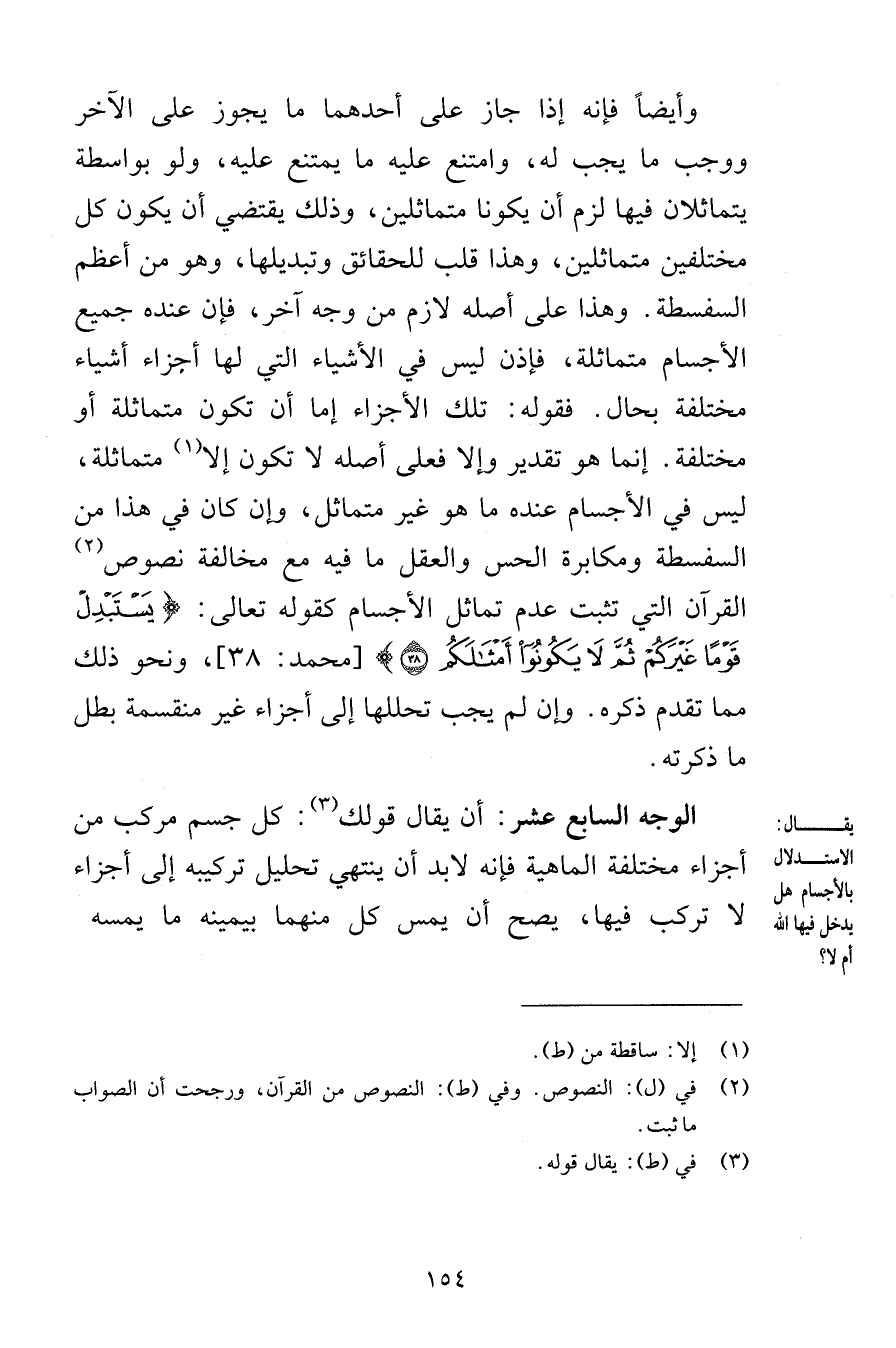 وأيضاً فإنه إذا جاز على أحدهما ما يجوز على الآخر ووجب ما يجب له وامتنع عليه ما يمتنع عليه ولو بواسطة يتماثلان فيها لزم أن يكونا متماثلين وذلك يقتضي أن يكون كل مختلفين متماثلين وهذا قلب للحقائق وتبديلها وهو من أعظم السفسطة وهذا على أصله لازم من وجه آخر فإن عنده جميع الأجسام متماثلة فإذن ليس في الأشياء التي لها أجزاء أشياء مختلفة بحال فقوله تلك الأجزاء إما أن تكون متماثلة أو مختلفة إنما هو تقدير وإلا فعلى أصله لا تكون إلا متماثلة ليس في الأجسام عنده ما هو غير متماثل وإن كان في هذا من السفسطة ومكابرة الحس والعقل ما فيه مع مخالفة نصوص القرآن التي تثبت عدم تماثل الأجسام كقوله تعالى يَسْتَبْدِلْ قَوْماً غَيْرَكُمْ ثُمَّ لَا يَكُونُوا أَمْثَالَكُمْ {38} [محمد 38] ونحو ذلك مما تقدم ذكره وإن لم يجب تحللها إلى أجزاء غير منقسمة بطل ما ذكرته الوجه السابع عشر أن يقال قولك كل جسم مركب من أجزاء مختلفة الماهية فإنه لابد أن ينتهي تحليل تركيبه إلى أجزاء لا تركب فيها يصح أن يمس كل منهما بيمينه ما يمسه