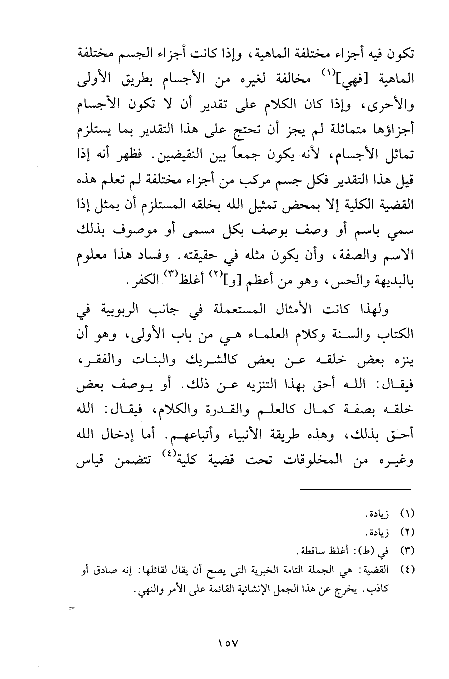 تكون فيه أجزاء مختلفة الماهية وإذا كانت أجزاء الجسم مختلفة الماهية فهي مخالفة لغيره من الأجسام بطريق الأولى والأحرى وإذا كان الكلام على تقدير أن لا تكون الأجسام أجزاؤها متماثلة لم يجز أن تحتج على هذا التقدير بما يستلزم تماثل الأجسام لأنه يكون جمعاً بين النقيضين فظهر أنه إذا قيل هذا التقدير فكل جسم مركب من أجزاء مختلفة لم تعلم هذه القضية الكلية إلا بمحض تمثيل الله بخلقه المستلزم أن يمثل إذا سمي باسم أو وصف بوصف بكل مسمى أو موصوف بذلك الاسم والصفة وأن يكون مثله في حقيقته وفساد هذا معلوم بالبديهة والحس وهو من أعظم وأغلظ الكفر ولهذا كانت الأمثال المستعملة في جانب الربوبية في الكتاب والسنة وكلام العلماء هي من باب الأولى وهو أن ينزه بعض خلقه عن بعض كالشريك والبنات والفقر فيقال الله أحق بهذا التنزيه عن ذلك أو يوصف بعض خلقه بصفة كمال كالعلم والقدرة والكلام فيقال الله أحق بذلك وهذه طريقة الأنبياء وأتباعهم أما إدخال الله وغيره من المخلوقات تحت قضية كلية تتضمن قياس