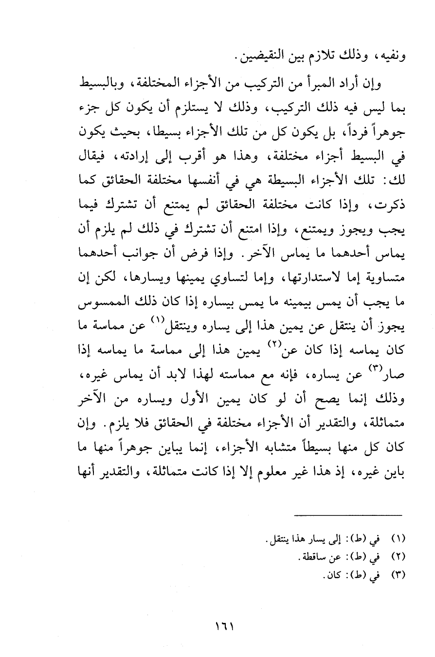 ونفيه وذلك تلازم بين النقيضين وإن أراد المبرأ من التركيب من الأجزاء المختلفة وبالبسيط بما ليس فيه ذلك التركيب وذلك لا يستلزم أن يكون كل جزء جوهراً فرداً بل يكون كل من تلك الأجزاء بسيطا بحيث يكون في البسيط أجزاء مختلفة وهذا هو اقرب إلى إرادته فيقال لك تلك الأجزاء البسيطة هي في أنفسها مختلفة الحقائق كما ذكرت وإذا كانت مختلفة الحقائق لم يمتنع أن تشترك فيما يجب ويجوز ويمتنع وإذا امتنع أن تشترك في ذلك لم يلزم أن يماس أحدهما ما يماس الآخر وإذا فرض أن جوانب أحدهما متساوية إما لاستدارتها وإما لتساوي يمينها ويسارها لكن إن ما يجب أن يمس بيمينه ما يمس بيساره إذا كان ذلك الممسوس يجوز أن ينتقل عن يمين هذا على يساره وينتقل عن مماسة ما كان يماسه إذا كان عن يمين هذا إلى مماسة ما يماسه إذا صار عن يساره فإنه مع مماسته لهذا لابد أن يماس غيره وذلك إنما يصح أن لو كان يمين الأول ويساره من الآخر متماثلة والتقدير أن الأجزاء مختلفة في الحقائق فلا يلزم وإن كان كل منها بسيطاً متشابه الأجزاء إنما يباين جوهراً منها ما باين غيره إذ هذا غير معلوم إلا إذا كانت متماثلة والتقدير أنها