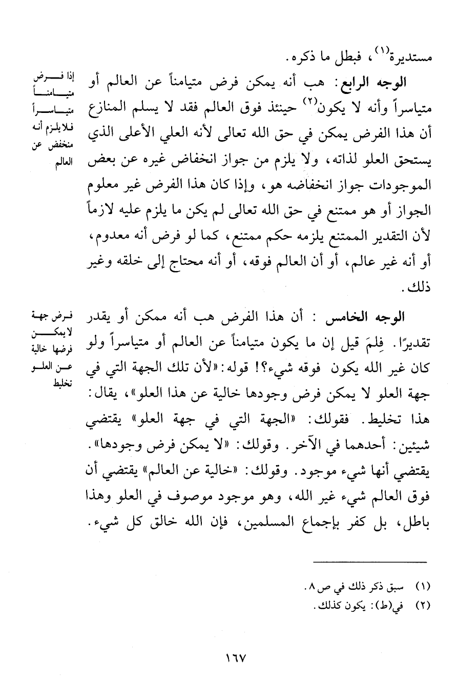 مستديرة فبطل ما ذكره الوجه الرابع هب أنه يمكن فرض متيامناً عن العالم أو متياسراً وأنه لا يكون حينئذ فوق العالم فقد لا يسلم المنازع أن هذا الفرض يمكن في حق الله تعالى لأنه العلي الأعلى الذي يستحق العلو لذاته ولا يلزم من جواز انخفاض غيره عن بعض الموجودات جواز انخفاضه هو وإذا كان هذا الفرض غير معلوم الجواز أو هو ممتنع في حق الله تعالى لم يكن ما يلزم عليه لازماً لأن التقدير الممتنع يلزمه حكم ممتنع كما لو فرض أنه معدوم أو أنه غير عالم أو أن العالم فوقه أو أنه محتاج إلى خلقه وغير ذلك الوجه الخامس أن هذا الفرض هب أنه ممكن أو يقدر تقديراً فلِمَ قيل إن ما يكون متيامناً عن العالم أو متياسراً ولو كان غير الله يكون فوقه شيء قوله لأن تلك الجهة التي في جهة العلو لا يمكن فرض وجودها خالية عن هذا العلو يقال هذا تخليط فقولك الجهة التي في جهة العلو يقتضي شيئين أحدهما في الآخر وقولك لا يمكن فرض وجودها يقتضي أنها شيء موجود وقولك خالية عن العالم يقتضي أن فوق العالم شيء غير الله وهو موجود موصوف في العلو وهذا باطل بل كفر بإجماع المسلمين فإن الله خالق كل شيء