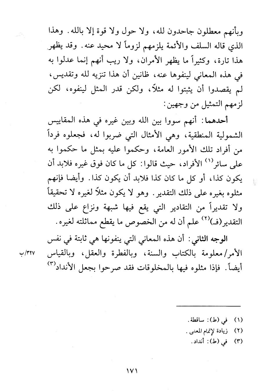 وبأنهم معطلون جاحدون لله ولا حول ولا قوة إلا بالله وهذا الذي قاله السلف والأئمة يلزمهم لزوماً لا محيد عنه وقد يظهر هذا تارة وكثيراً ما يظهر الأمران ولا ريب أنهم إنما عدلوا به في هذه المعاني لينفوها عنه ظانين أن هذا تنزيه لله وتقديس لم يقصدوا أن يثبتوا له مثلاً ولكن قدر المثل لينفوه لكن لزمهم التمثيل من وجهين أحدهما أنهم سووا بين الله وبين غيره في هذه المقاييس الشمولية المنطقية وهي الأمثال التي ضربوا له فجعلوه فرداً من أقراد تلك الأمور العامة وحكموا عليه بمثل ما حكموا به على سائر الأفراد حيث قالوا كل ما كان فوق غيره فلابد أن يكون كذا أو كل ما كان كذا فلابد أن يكون كذا وأيضا فإنهم مثلوه بغيره على ذلك التقدير وهو لا يكون مثلاً لغيره لا تحقيقاً ولا تقديراً من التقادير التي يقع فيها شبهة ونزاع على ذلك التقدير فـ علم أن له من الخصوص ما يقطع مماثلته لغيره الوجه الثاني أن هذه المعاني التي ينفونها هي ثابتة في نفس الأمر معلومة بالكتاب والسنة وبالفطرة والعقل وبالقياس أيضاً فإذا مثلوه فيها بالمخلوقات فقد صرحوا بجعل الأنداد