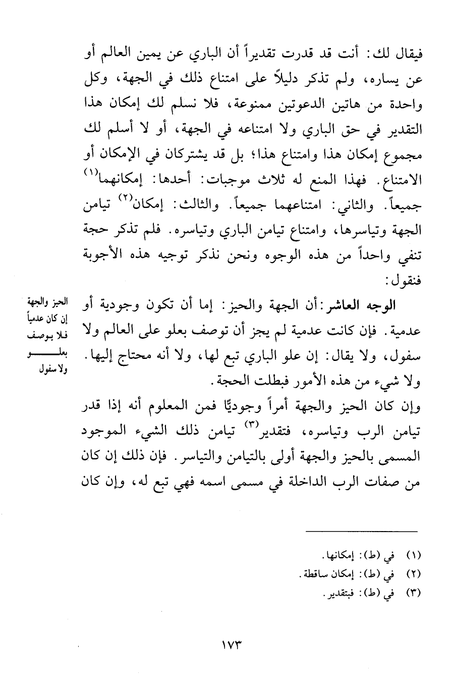 فيقال لك أنت قد قدرت تقديراً أن الباري عن يمين العالم أو عن يساره ولم تذكر دليلاً على امتناع ذلك في الجهة وكل واحدة من هاتين الدعوتين ممنوعة فلا نسلم لك إمكان هذا التقدير في حق الباري ولا امتناعه في الجهة أو لا أسلم لك مجموع إمكان هذا وامتناع هذا بل قد يشتركان في الإمكان أو الامتناع فهذا المنع له ثلاث موجبات أحدها إمكانهما جميعاً والثاني امتناعهما جميعاً والثالث إمكان تيامن الجهة وتياسرها وامتناع تيامن الباري وتياسره فلم تذكر حجة تنفي واحداً من هذه الوجوه ونحن نذكر توجيه هذه الأجوبة فنقول الوجه العاشر أن الجهة والحيز إما أن تكون وجودية أو عدمية فإن كانت عدمية لم يجز أن توصف بعلو على العالم ولا سفول ولا يقال إن علو الباري تبع لها ولا أنه محتاج إليها ولا شيء من هذه الأمور فبطلت الحجة وإن كان الحيز والجهة أمراً وجوديًّا فمن المعلوم أنه إذا قدر تيامن الرب وتياسره فتقدير تيامن ذلك الشيء الموجود المسمى بالحيز والجهة أولى بالتيامن والتياسر فإن ذلك إن كان من صفات الرب الداخلة في مسمى اسمه فهي تبع له وإن كان