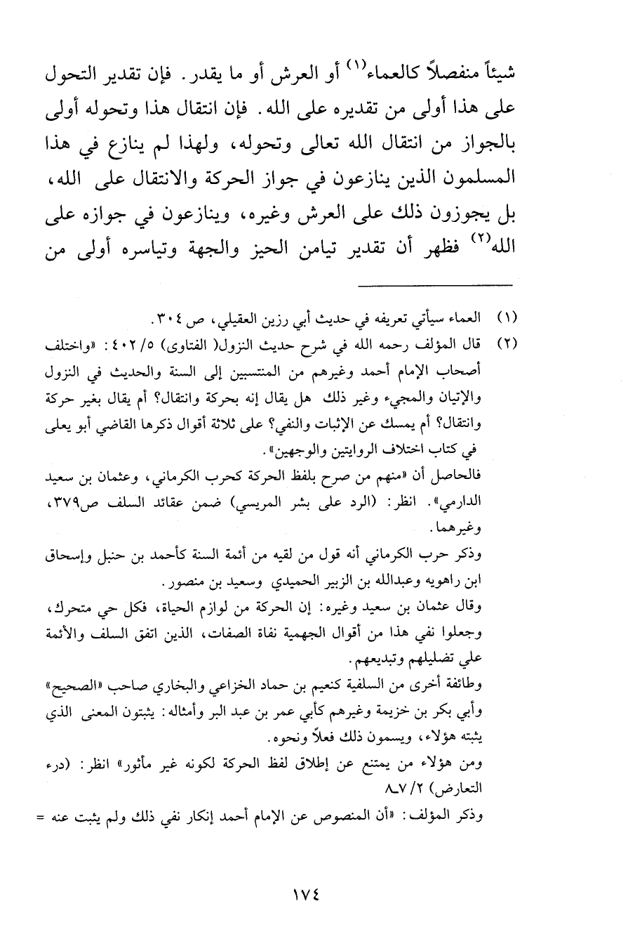 شيئاً منفصلاً كالعماء أو العرش أو ما يقدر فإن تقدير التحول على هذا أولى من تقديره على الله فإن انتقال هذا وتحوله أولى بالجواز من انتقال الله تعالى وتحوله ولهذا لم ينازع في هذا المسلمون الذين ينازعون في جواز الحركة والانتقال على الله بل يجوزون ذلك على العرش وغيره وينازعون في جوازه على الله فظهر أن تقدير تيامن الحيز والجهة وتياسره أولى من
