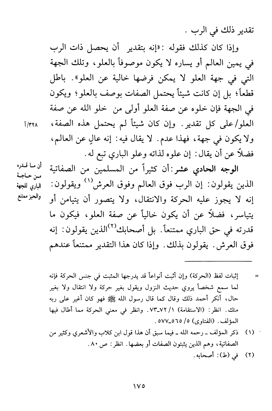تقدير ذلك في الرب وإذا كان كذلك فقوله إنه بتقدير أن يحصل ذات الرب في يمين العالم أو يساره لا يكون موصوفاً بالعلو وتلك الجهة التي في جهة العلو لا يمكن فرضها خالية عن العلو باطل قطعاً بل إن كانت شيئاً يحتمل الصفات بوصف العلو ويكون في الجهة فإن خلوه عن صفة العلو أولى من خلو الله عن صفة العلو على كل تقدير وإن كان شيئاً لم يحتمل هذه الصفة ولا يكون في جهة فهذا عدم لا يقال فيه إنه عالٍ عن العالم فضلاً عن أن يقال إن علوه لذاته وعلو الباري تبع له الوجه الحادي عشر أن كثيراً من المسلمين من الصفاتية الذين يقولون إن الرب فوق العالم وفوق العرش يقولون إنه لا يجوز عليه الحركة والانتقال ولا يتصور أن يتيامن أو يتياسر فضلاً عن أن يكون خالياً عن صفة العلو فيكون ما قدرته في حق الباري ممتنعاً بل أصحابك الذين يقولون إنه فوق العرش يقولون بذلك وإذا كان هذا التقدير ممتنعاً عندهم