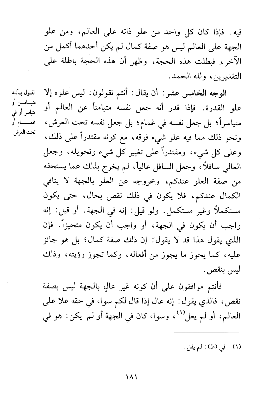 فيه فإذا كان كل واحد من علو ذاته على العالم ومن علو الجهة على العالم ليس هو صفة كمال لم يكن أحدهما أكمل من الآخر فبطلت هذه الحجة وظهر أن هذه الحجة باطلة على التقديرين ولله الحمد الوجه الخامس عشر أن يقال أنتم تقولون ليس علوه إلا علو القدرة فإذا قدر أنه جعل نفسه متيامناً عن العالم أو متياسراً بل جعل نفسه في غمام بل جعل نفسه تحت العرش ونحو ذلك مما فيه علو شيء فوقه مع كونه مقتدراً على ذلك وعلى كل شيء ومقتدراً على تغيير كل شيء وتحويله وجعل العالي سافلاً وجعل السافل عالياً لم يخرج بذلك عما يستحقه من صفة العلو عندكم وخروجه عن العلو بالجهة لا ينافي الكمال عندكم فلا يكون في ذلك نقص بحال حتى يكون مستكملاً وغير مستكمل ولو قيل إنه في الجهة أو قيل إنه واجب أن يكون في الجهة أو واجب أن يكون متحيزاً فإن الذي قد يقول هذا قد لا يقول إن ذلك صفة كمال بل هو جائز عليه كما يجوز ما يجوز من أفعاله وكما تجوز رؤيته وذلك ليس بنقص فأنتم موافقون على أن كونه غير عالٍ بالجهة ليس بصفة نقص فالذي يقول إنه عال إذا قال لكم سواء في حقه علا على العالم أو لم يعل وسواء كان في الجهة أو لم يكن هو في