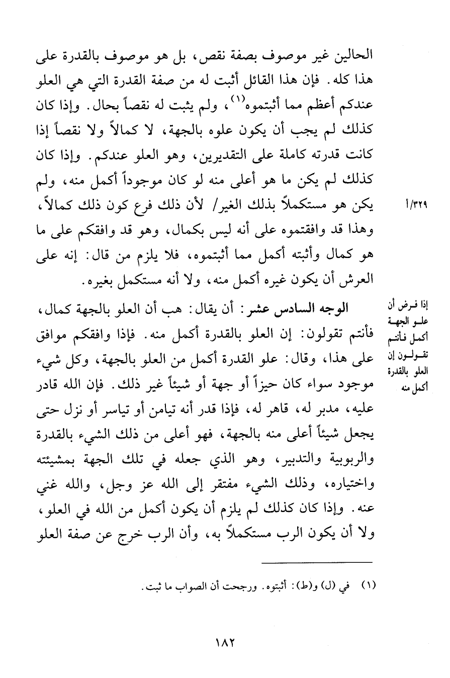 الحالين غير موصوف بصفة نقص بل هو موصوف بالقدرة على هذا كله فإن هذا القائل أثبت له من صفة القدرة التي هي العلو عندكم أعظم مما أثبتموه ولم يثبت له نقصاً بحال وإذا كان كذلك لم يجب أن يكون علوه بالجهة لا كمالاً ولا نقصاً إذا كانت قدرته كاملة على التقديرين وهو العلو عندكم وإذا كان كذلك لم يكن ما هو أعلى منه لو كان موجوداً أكمل منه ولم يكن هو مستكملاً بذلك الغير لأن ذلك فرع كون ذلك كمالاً وهذا قد وافقتموه على أنه ليس بكمال وهو قد وافقكم على ما هو كمال وأثبته أكمل مما أثبتموه فلا يلزم من قال إنه على العرش أن يكون غيره أكمل منه ولا أنه مستكمل بغيره الوجه السادس عشر أن يقال هب أن العلو بالجهة كمال فأنتم تقولون إن العلو بالقدرة أكمل منه فإذا وافقكم موافق على هذا وقال علو القدرة أكمل من علو بالجهة وكل شيء موجود سواء كان حيزاً أو جهة أو شيئاً غير ذلك فإن الله قادر عليه مدبر له قاهر له فإذا قدر أنه تيامن أو تياسر أو نزل حتى يجعل شيئاً أعلى منه بالجهة فهو أعلى من ذلك الشيء بالقدرة والربوبية والتدبير وهو الذي جعله في تلك الجهة بمشيئته واختياره وذلك الشيء مفتقر إلى الله عز وجل والله غني عنه وإذا كان كذلك لم يلزم أن يكون أكمل من الله في العلو ولا أن يكون الرب مستكملاً به وأن الرب خرج عن صفة العلو