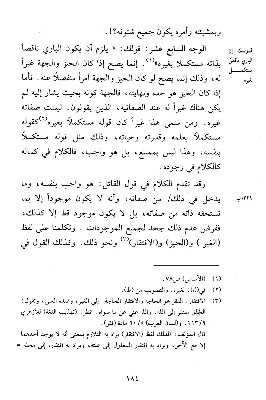 وبمشيئته وأمره يكون جميع شئونه الوجه السابع عشر قولك يلزم أن يكون الباري ناقصاً بذاته مستكملا بغيره إنما يصح إذا كان الحيز والجهة غيراً له وذلك إنما يصح لو كان الحيز والجهة أمراً منفصلاً عنه فأما إذا كان الحيز هو حده ونهايته فالجهة كونه بحيث يشار إليه لم يكن هناك غيراً له عند الصفاتية الذين يقولون ليست صفاته غيره ومن سمى هذا غيراً كان قوله مستكملاً بغيره كقوله مستكملاً بعلمه وقدرته وحياته وذلك مثل قوله مستكملاً بنفسه وهذا ليس بممتنع بل هو واجب كالكلام في كماله كالكلام في وجوده وقد تقدم الكلام في قول القائل هو واجب بنفسه وما يدخل في ذلك من صفاته وأنه لا يكون موجوداً إلا بما تستحقه ذاته من صفاته بل لا يكون موجود قط إلا كذلك ففرض عدم ذلك جحد لجميع الموجودات وتكلمنا على لفظ الغير والحيز والافتقار ونحو ذلك وكذلك القول في
