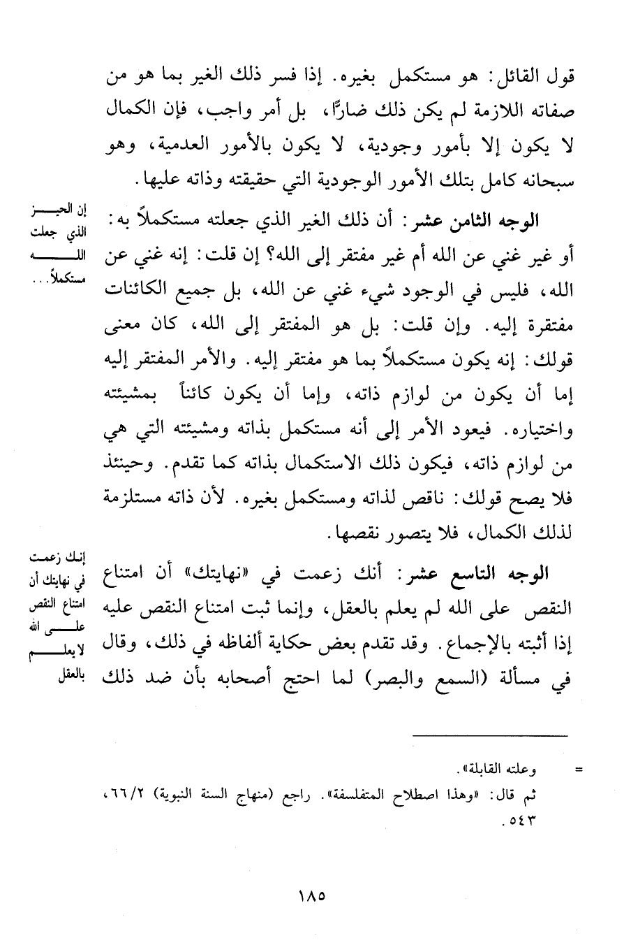 قول القائل هو مستكمل بغيره إذا فسر ذلك الغير بما هو من صفاته اللازمة لم يكن ذلك ضارًّا بل أمر واجب فإن الكمال لا يكون بأمور وجودية لا يكون بالأمور العدمية وهو سبحانه كامل بتلك الأمور الوجودية التي حقيقته وذاته عليها الوجه الثامن عشر أن ذلك الغير الذي جعلته مستكملاً به أو غير غني عن الله أم غير مفتقر إلى الله إن قلت إنه غني عن الله فليس في الوجود شيء غني عن الله بل جميع الكائنات مفتقرة إليه وإن قلت بل هو المفتقر إلى الله كان معنى قولك إنه يكون مستكملاً بما هو مفتقر إليه والأمر المفتقر إليه إما أن يكون من لوازم ذاته وإما أن يكون كائناً بمشيئته واختياره فيعود الأمر إلى أنه مستكمل بذاته ومشيئته التي هي من لوازم ذاته فيكون ذلك الاستكمال بذاته كما تقدم وحينئذ فلا يصح قولك ناقص لذاته ومستكمل بغيره لأن ذاته مستلزمة لذلك الكمال فلا يتصور نقصها الوجه التاسع عشر أنك زعمت في نهايتك أن امتناع النقص على الله لم يعلم بالعقل وإنما ثبت امتناع النقص عليه إذا أثبته بالإجماع وقد تقدم بعض حكاية ألفاظه في ذلك وقال في مسألة السمع والبصر لما احتج أصحابه بأن ضد ذلك