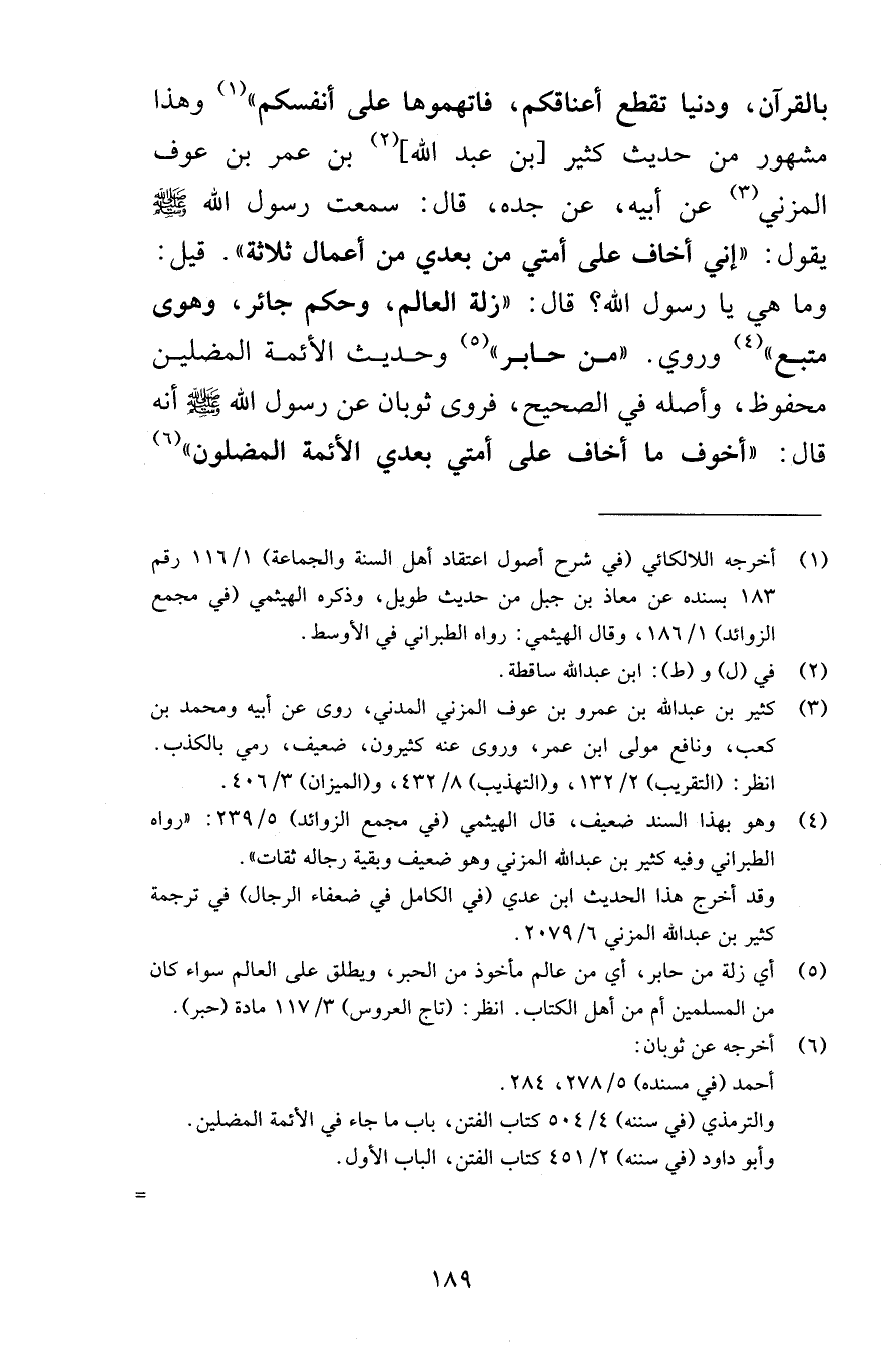 بالقرآن ودنيا تقطع أعناقكم فاتهموها على أنفسكم وهذا مشهور من حديث كثير بن عبد الله بن عمر بن عوف المزني عن أبيه عن جده قال سمعت رسول اله صلى الله عليه وسلم يقول إني أخاف على أمتي من بعدي من أعمال ثلاثة قيل وما هي يا رسول الله قال زلة العالم وحكم جائر وهوى متبع وروي من حابر وحديث الأئمة والمضلين محفوظ وأصله في الصحيح فروى ثوبان عن رسول الله صلى الله عليه وسلم أنه قال أخوف ما أخاف على أمتي بعدي الأئمة المضلون