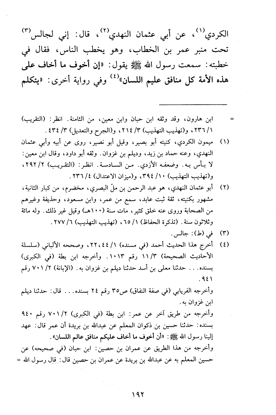 الكردي عن أبي عثمان النهدي قال إني لجالس تحت منبر عمر بن الخطاب وهو يخطب الناس فقال في خطبته سمعت رسول الله صلى الله عليه وسلم يقول إني أخوف ما أخاف على هذه الأمة كل منافق عليم اللسان وفي رواية أخرى يتكلم