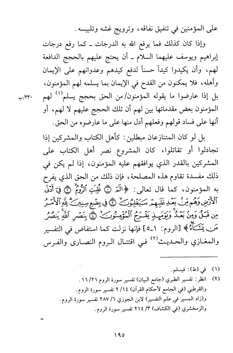 على المؤمنين في تنفيق نفاقه وترويج غشه وتلبيسه وإذا كان كذلك فما يرفع الله به الدرجات كما رفع درجات إبراهيم ويوسف عليهما السلام أن يحتج عليهم بالحجج الدافعة لهم وأن يكيدوا كيداً حسناً لدفع كيدهم وعدوانهم على الإيمان وأهله فلا يمكنون من القدح في الإيمان بما يسلمه لهم المؤمنون بل إذا عارضوا ما يقوله المؤمنون من الحق بحجج يسلم لهم المؤمنون بعض مقدماتها بين لهم أن تلك الحجج عليهم لا لهم أو أنها على فساد قولهم وفعلهم أدل منها على ما عارضوه من الحق بل لو كان المتنازعان مبطلين كأهل الكتاب والمشركين إذا تجادلوا أو تقاتلوا كان المشروع نصر أهل الكتاب على المشركين بالقدر الذي يوافقهم عليه المؤمنون إذا لم يكن في ذلك مفسدة تقاوم هذه المصلحة فإن ذلك من الحق الذي يفرح به المؤمنون كما قال تعالى الم {1} غُلِبَتِ الرُّومُ {2} فِي أَدْنَى الْأَرْضِ وَهُم مِّن بَعْدِ غَلَبِهِمْ سَيَغْلِبُونَ {3} فِي بِضْعِ سِنِينَ لِلَّهِ الْأَمْرُ مِن قَبْلُ وَمِن بَعْدُ وَيَوْمَئِذٍ يَفْرَحُ الْمُؤْمِنُونَ {4} بِنَصْرِ اللَّهِ يَنصُرُ مَن يَشَاءُ وَهُوَ الْعَزِيزُ الرَّحِيمُ {5} [الروم 1-5] فإنها نزلت كما استفاض في التفسير والمغازي والحديث في اقتتال الروم النصارى والفرس