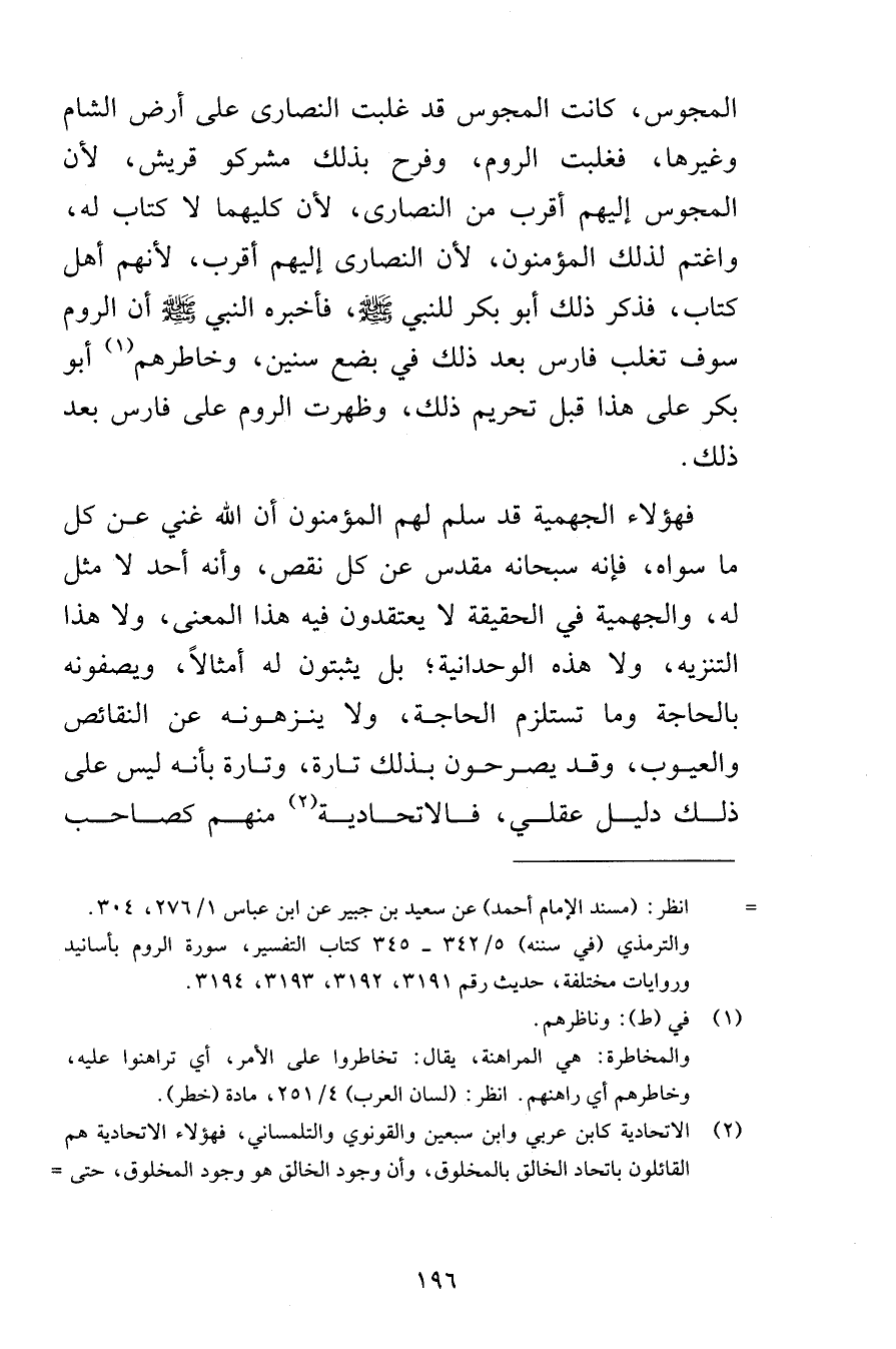 المجوس كانت المجوس قد غلبت النصارى على أرض الشام وغيرها فغلبت الروم وفرح بذلك مشركو قريش لأن المجوس إليهم أقرب من النصارى لأن كليهما لا كتاب له واغتم لذلك المؤمنون لأن النصارى إليهم أقرب لأنهم أهل كتاب فذكر ذلك أبو بكر للنبي صلى الله عليه وسلم فأخبره لنبي صلى الله عليه وسلم أن الروم سوف تغلب فارس بعد ذلك في بضع سنين وخاطرهم أبو بكر على هذا قبل تحريم ذلك وظهرت الروم على فارس بعد ذلك فهؤلاء الجهمية قد سلم لهم المؤمنون أن الله غني عن كل ما سواه فإنه سبحانه مقدس عن كلا نقص وأنه أحد لا مثل له والجهمية في الحقيقة لا يعتقدون فيه هذا المعنى ولا هذا التنزيه ولا هذه الوحدانية بل يثبتون له أمثالاً ويصفونه بالحاجة وما تستلزم الحاجة ولا ينزهونه عن النقائص والعيوب وقد يصرحون بذلك تارة وتارة بأنه ليس على ذلك دليل عقلي فالاتحادية منهم كصاحب