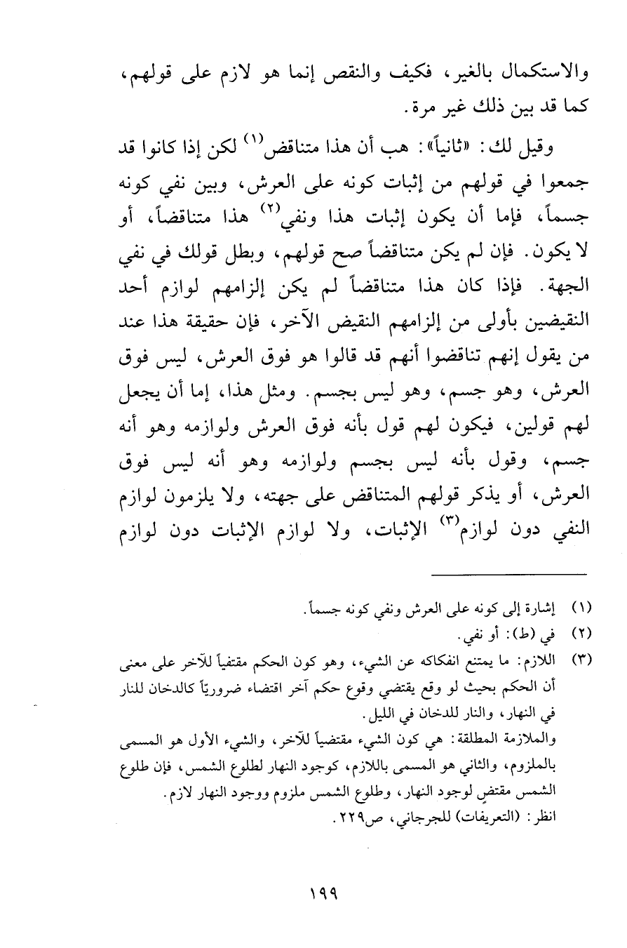 والاستكمال بالغير فكيف والنقص إنما هو لازم على قولهم كما قد بين ذلك غير مرة وقيل لك ثانياً هب أن هذا متناقض لكن إذا كانوا قد جمعوا في قولهم من إثبات كونه على العرش وبين نفي كونه جسماً فإما أن يكون إثبات هذا ونفي هذا متناقضاً أو لا يكون فإن لم يكن متناقضاً صح قولهم وبطل قولك في نفي الجهة فإذا كان هذا متناقضاً لم يكن إلزامهم لوازم أحد النقيضين بأولى من إلزامهم النقيض الآخر فإن حقيقة هذا عند من يقول إنهم تناقضوا أنهم قد قالوا هو فوق العرش ليس فوق العرش وهو جسم وهو ليس بجسم ومثل هذا إما أن يجعل لهم قولين فيكون لهم قول بأنه فوق العرش ولوازمه وهو أنه جسم وقول بأنه ليس بجسم ولوازمه وهو أنه ليس فوق العرش أو يذكر قولهم المتناقض على جهته ولا يلزمون لوازم النفي دون لوازم الإثبات ولا لوازم الإثبات دون لوازم