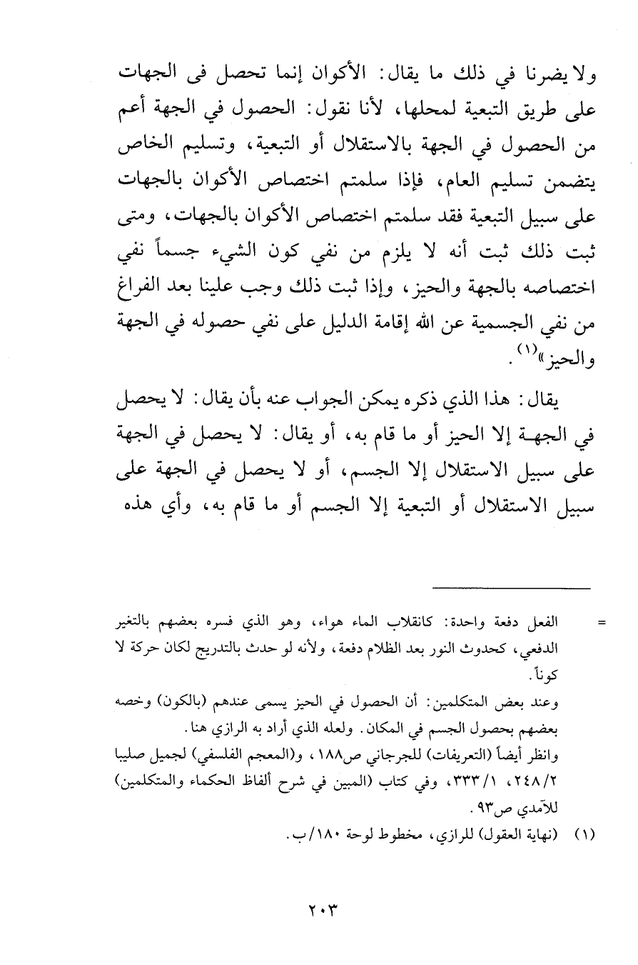 ولا يضرنا في ذلك ما يقال الأكوان إنما تحصل في الجهات على طريق التبعية لمحلها لأنا نقول الحصول في الجهة أعم من الحصول في الجهة بالاستقلال أو التبعية وتسليم الخاص يتضمن تسليم العام فإذا سلمتم اختصاص الأكوان بالجهات على سبيل التبعية فقد سلمتم اختصاص الأكوان بالجهات ومتى ثبت ذلك ثبت أنه لا يلزم من نفي كون الشيء جسماً نفي اختصاصه بالجهة والحيز وإذا ثبت ذلك وجب علينا بعد الفراغ من نفي الجسمية عن الله إقامة الدليل على نفي حصوله في الجهة والحيز يقال هذا الذي ذكره يمكن الجواب عنه بأن يقال لا يحصل في الجهة إلا الحيز أو ما قام به أو يقال لا يحصل في الجهة على سبيل الاستقلال إلا الجسم أو لا يحصل في الجهة على سبيل الاستقلال أو التبعية إلا الجسم أو ما قام به وأي هذه