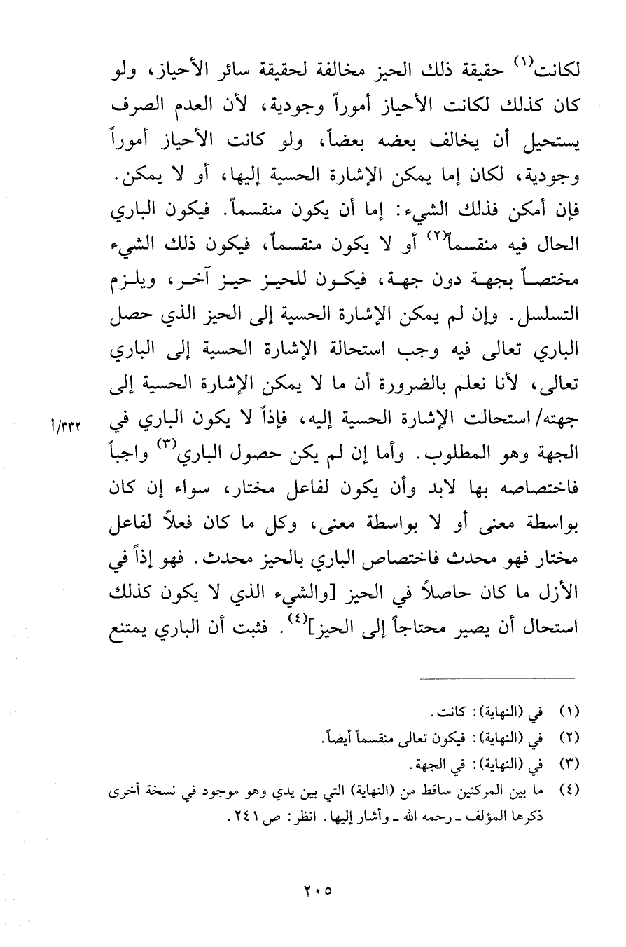 لكانت حقيقة ذلك الحيز مخالفة لحقيقة سائر الأحياز ولو كان كذلك لكانت الأحياز أموراً وجودية لأن العدم الصرف يستحيل أن يخالف بعضه بعضاً ولو كانت الأحياز أموراً وجودية لكان إما يمكن الإشارة الحسية إليها أو لا يمكن فإن أمكن فذلك الشيء إما أن يكون منقسماً فيكون الباري الحال فيه منقسماً أو لا يكون منقسماً فيكون ذلك الشيء مختصاً بجهة دون جهة فيكون للحيز حيز آخر ويلزم التسلسل وإن لم يمكن الإشارة الحسية إلى الحيز الذي حصل الباري تعالى فيه وجب استحالة الإشارة الحسية إلى الباري تعالى لأنا نعلم بالضرورة أن ما لا يمكن الإشارة الحسية إلى جهته استحالت الإشارة الحسية إليه فإذاً لا يكون الباري في الجهة وهو المطلوب وأما إن لم يكن حصول الباري واجباً فاختصاصه بها لابد وأن يكون لفاعل مختار سواء إن كان بواسطة معنى أو لا بواسطة معنى وكل ما كان فعلاً لفاعل مختار فهو محدث فاختصاص الباري بالحيز محدث فهو إذاً في الأزل ما كان حاصلاً في الحيز والشيء الذي لا يكون كذلك استحال أن يصير محتاجاً إلى الحيز فثبت أن الباري يمتنع