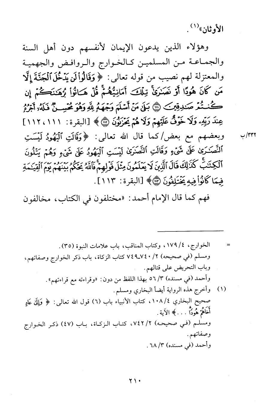 الأوثان وهؤلاء الذين يدعون الإيمان لأنفسهم دون أهل السنة والجماعة من المسلمين كالخوارج والروافض والجهمية والمعتزلة لهم نصيب من قوله تعالى وَقَالُواْ لَن يَدْخُلَ الْجَنَّةَ إِلاَّ مَن كَانَ هُوداً أَوْ نَصَارَى تِلْكَ أَمَانِيُّهُمْ قُلْ هَاتُواْ بُرْهَانَكُمْ إِن كُنتُمْ صَادِقِينَ {111} بَلَى مَنْ أَسْلَمَ وَجْهَهُ لِلّهِ وَهُوَ مُحْسِنٌ فَلَهُ أَجْرُهُ عِندَ رَبِّهِ وَلاَ خَوْفٌ عَلَيْهِمْ وَلاَ هُمْ يَحْزَنُونَ {112} [البقرة 111-112] وبعضهم مع بعض كما قال الله تعالى وَقَالَتِ الْيَهُودُ لَيْسَتِ النَّصَارَى عَلَىَ شَيْءٍ وَقَالَتِ النَّصَارَى لَيْسَتِ الْيَهُودُ عَلَى شَيْءٍ وَهُمْ يَتْلُونَ الْكِتَابَ كَذَلِكَ قَالَ الَّذِينَ لاَ يَعْلَمُونَ مِثْلَ قَوْلِهِمْ فَاللهُ يَحْكُمُ بَيْنَهُمْ يَوْمَ الْقِيَامَةِ فِيمَا كَانُواْ فِيهِ يَخْتَلِفُونَ {113} [البقرة 113] فهم كما قال الإمام أحمد مختلفون في الكتاب مخالفون