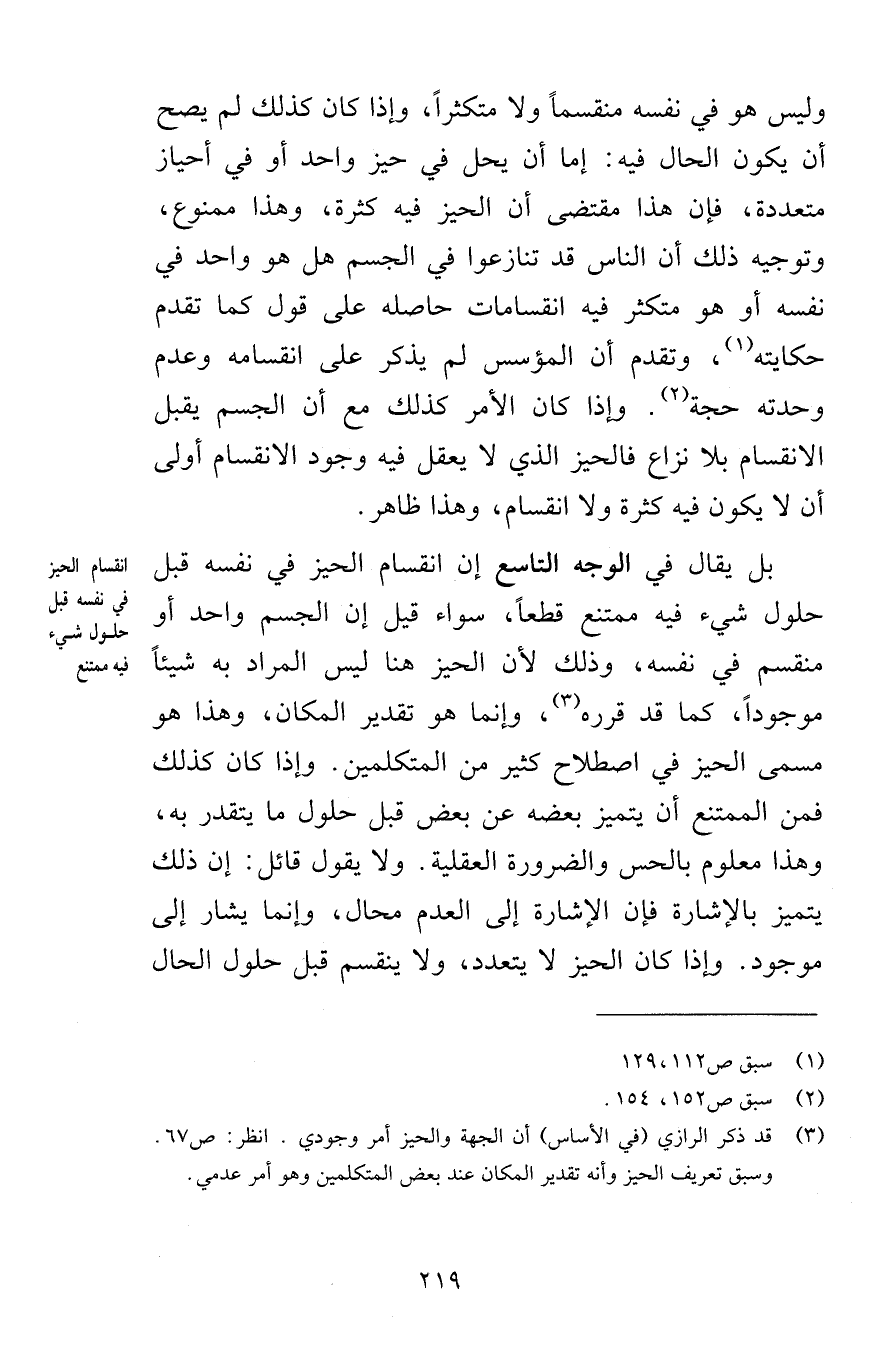 وليس هو في نفسه منقسماً ولا متكثراً وإذا كان كذلك لم يصح أن يكون الحال فيه إما أن يحل في حيز واحد أو في أحياز متعددة فإن هذا مقتضى أن الحيز فيه كثرة وهذا ممنوع وتوجيه ذلك أن الناس قد تنازعوا في الجسم هل هو واحد في نفسه أو هو متكثر فيه انقسامات حاصلة على قول كما تقدم حكايته وتقدم أن المؤسس لم يذكر على انقسامه وعدمه وحدته حجة وإذا كان الأمر كذلك مع أن الجسم يقبل الانقسام بلا نزاع فالحيز الذي لا يعقل فيه وجود الانقسام أولى أن لا يكون فيه كثرة ولا انقسام وهذا ظاهر بل يقال في الوجه التاسع إن انقسام الحيز في نفسه قبل حلول شيء فيه ممتنع قطعاً سواء قيل إن الجسم واحد أو منقسم في نفسه وذلك لأن الحيز هنا ليس المراد به شيئاً موجوداً كما قد قرره وإنما هو تقدير المكان وهذا هو مسمى الحيز في اصطلاح كثير من المتكلمين وإذا كان كذلك فمن الممتنع أن يتميز بعضه عن بعض قبل حلول ما يتقد ربه وهذا معلوم بالحس والضرورة العقلية ولا يقول قائل إن ذلك يتميز بالإشارة فإن الإشارة إلى العدم محال وإنما يشار إلى موجود وإذا كان الحيز لا يتعدد ولا ينقسم قبل حلول الحال