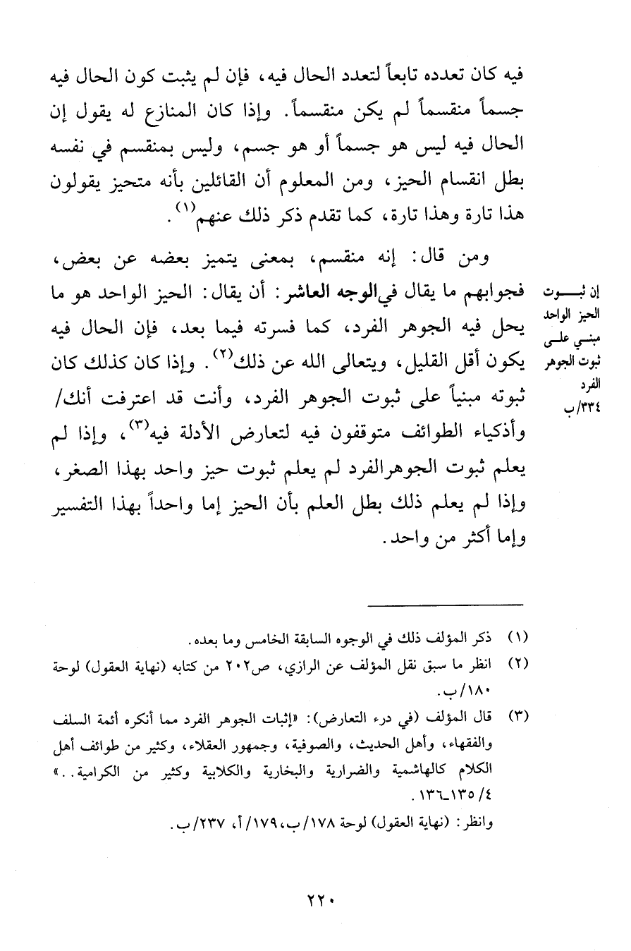 فيه كان تعدده تابعاً لتعدد الحال فيه فإن لم يثبت كون الحال فيه جسماً منقسماً لم يكن منقسماً وإذا كان المنازع له يقول إن الحال فيه ليس هو جسماً أو هو جسم وليس بمنقسم في نفسه بطل انقسام الحيز ومن المعلوم أن القائلين بأنه متحيز يقولون هذا تارة وهذا تارة كما تقدم ذكر ذلك عنهم ومن قال إنه منقسم بمعنى يتميز بعضه عن بعض فجوابهم ما يقال في الوجه العاشر أن يقال الحيز الواحد هو ما يحل فيه الجوهر الفرد كما فسرته فيما بعد فإن الحال فيه يكون أقل القليل ويتعالى الله عن ذلك وإذا كان كذلك كان ثبوته مبنياً على ثبوت الجوهر الفرد وأنت قد اعترفت أنك وأذكياء الطوائف متوقفون فيه لتعارض الأدلة فيه وإذا لم يعلم ثبوت الجوهرالفرد لم يعلم ثبوت حيز واحد بهذا الصغر وإذا لم يعلم ذلك بطل العلم بأن الحيز إما واحداً بهذا التفسير وإما أكثر من واحد